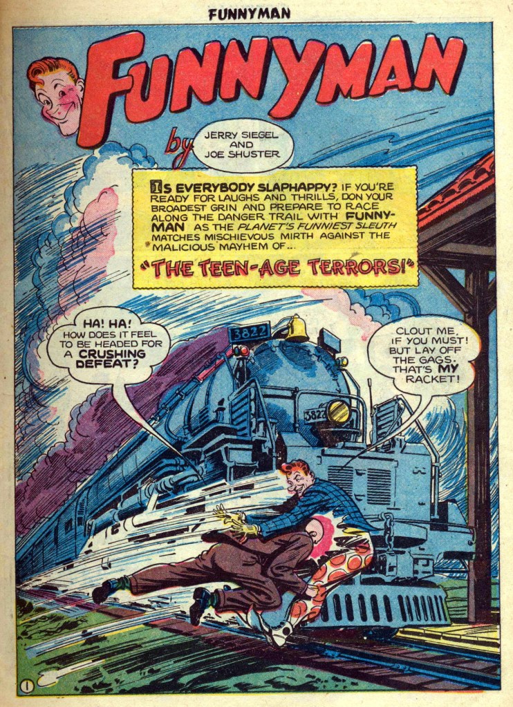 Funnyman was written by Jerry Siegel and drawn by Joe Shuster and what remained of the Shuster Art Studio that had been producing Superman stories. The stories in the series’ first issue were mostly penciled by John Sikela over Shuster’s rough layouts, and inked by a just-starting-out Dick Ayers. For all that the Siegel and Shuster team’s byline is prominent on the cover, as is a blurb connecting them to Superman, the actual cover art was done by Marvin stein apparently.