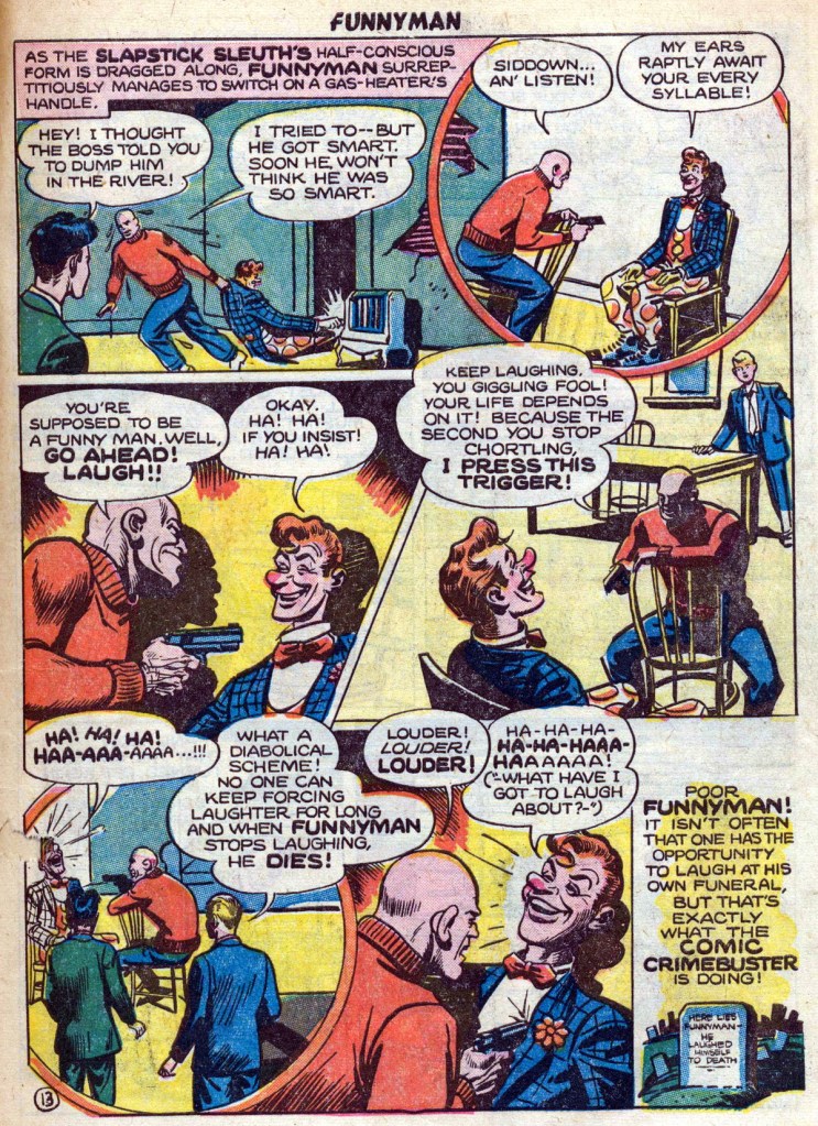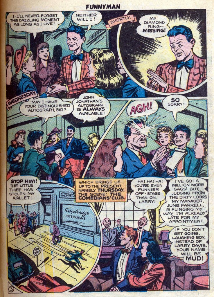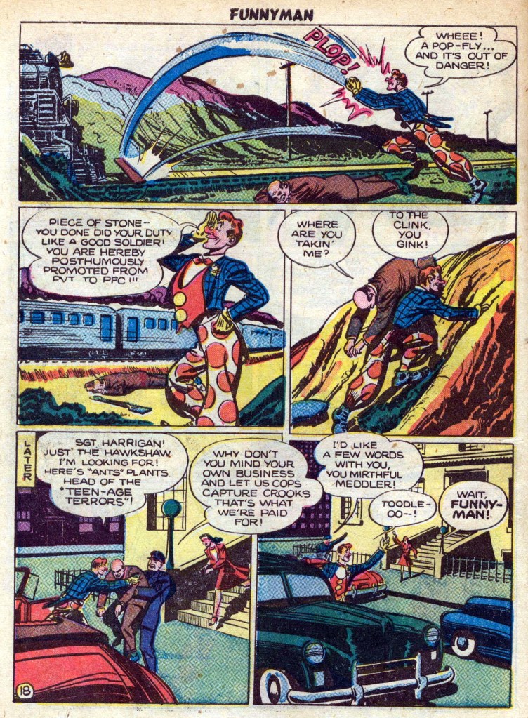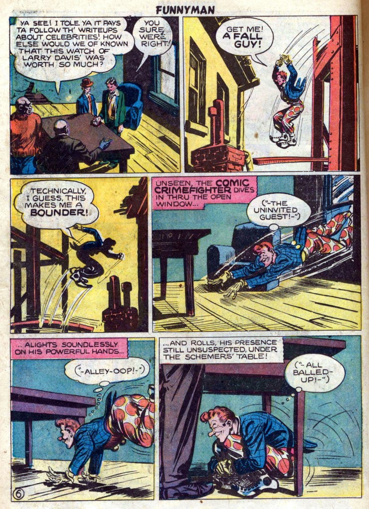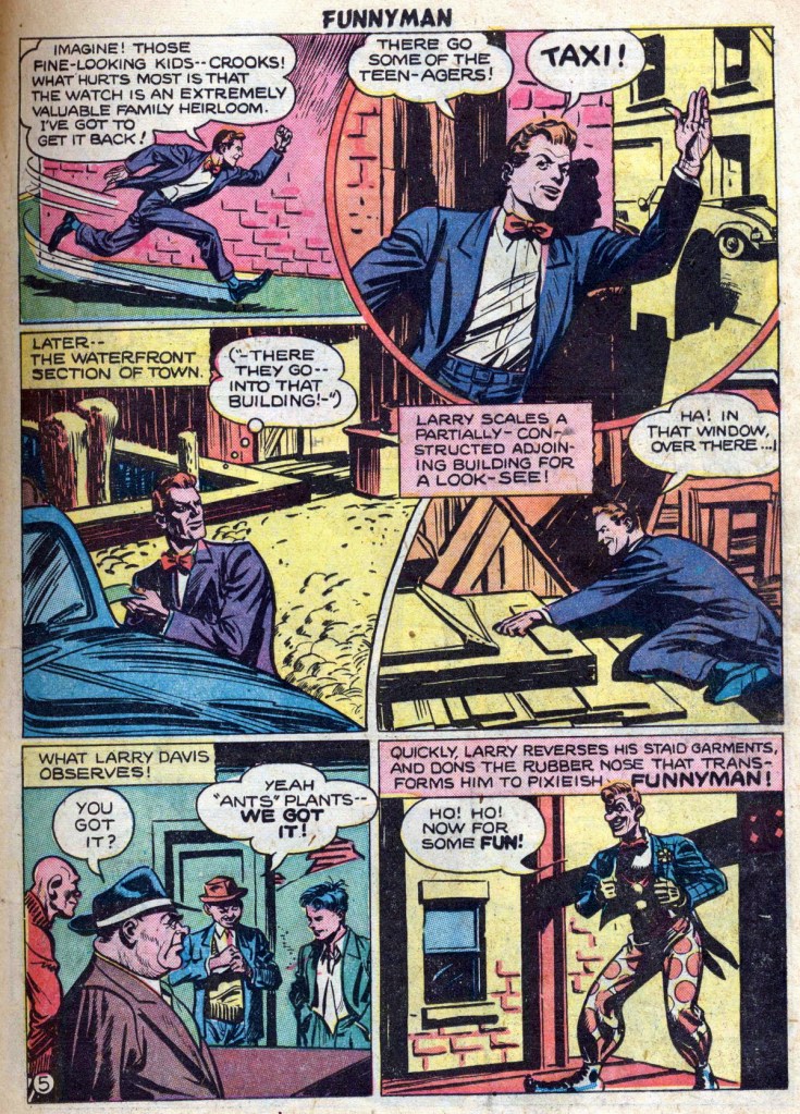 Funnyman was comedian Larry Davis. In an attempt to score some cheap publicity at the advice of his manager June Farrell, Davis dresses up as Funnyman and is sent to foil a pretend robbery. But it turns out that an actual robbery is taking place at the same time, and Davis winds up clobbering the actual criminals. Inspired by his success, he decides to continue on in the role of Funnyman, despite really having no motivation to do so other than the adrenaline rush and perhaps a bit of a death wish. The performer-who-becomes-the-thing-he-performs-as gag was a tired trope even when the character debuted, but the origin was simply backstory, something to quickly explain who Davis was before the actual adventures could begin.