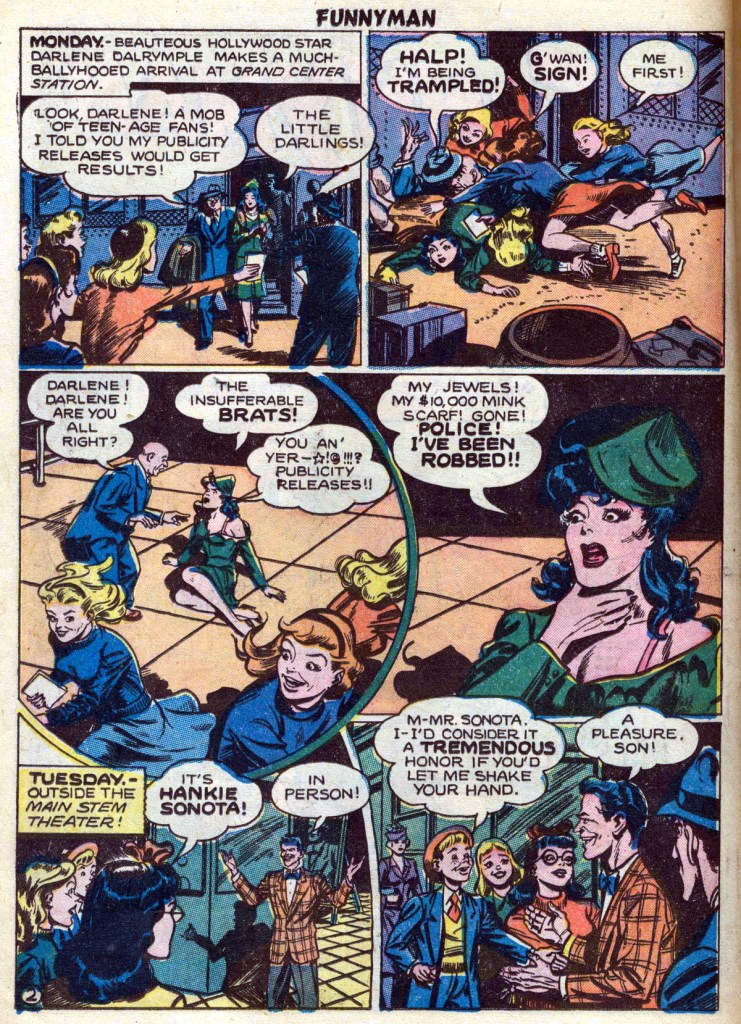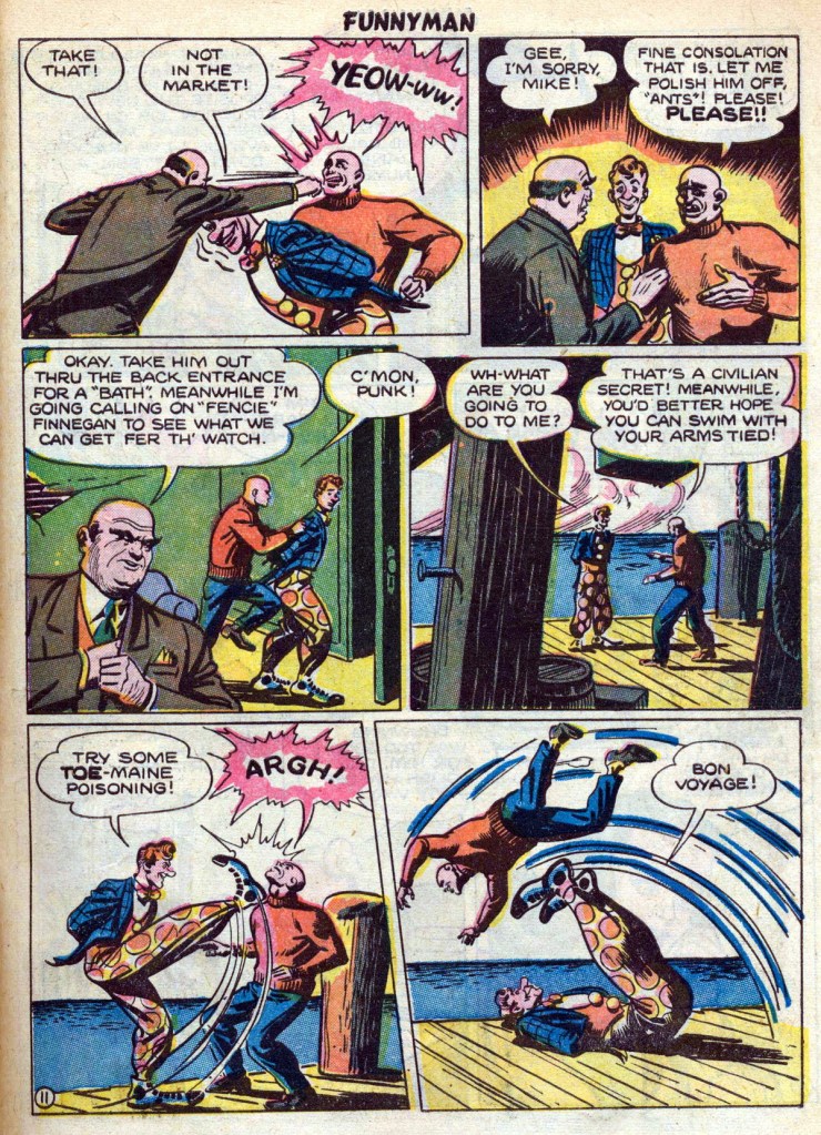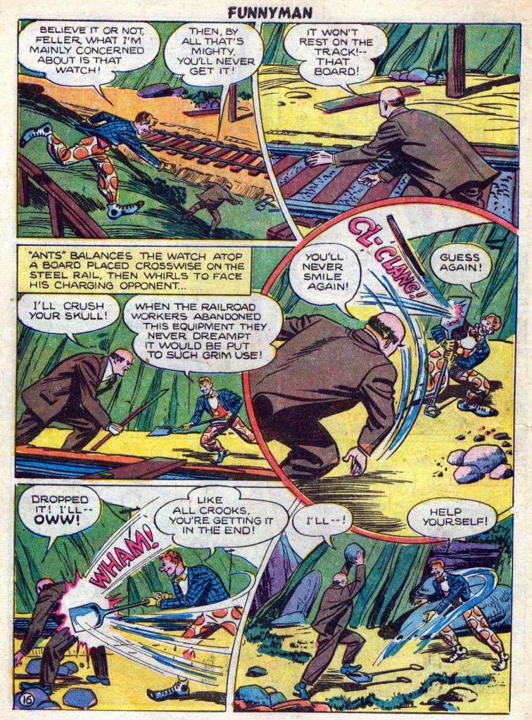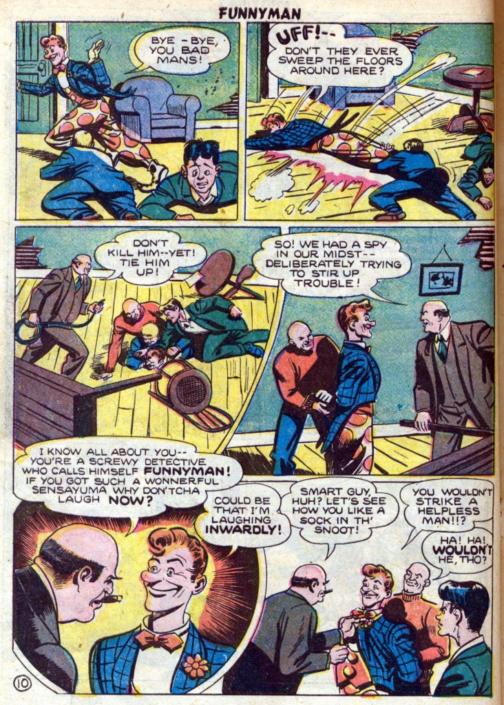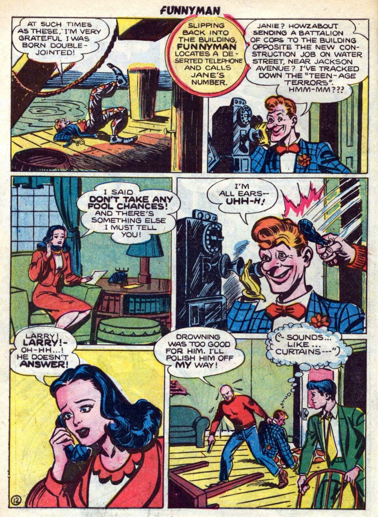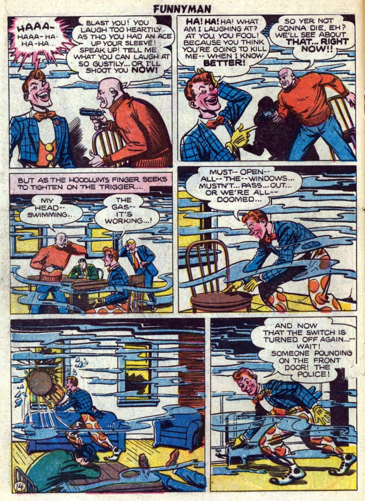 Funnyman was comedian Larry Davis. In an attempt to score some cheap publicity at the advice of his manager June Farrell, Davis dresses up as Funnyman and is sent to foil a pretend robbery. But it turns out that an actual robbery is taking place at the same time, and Davis winds up clobbering the actual criminals. Inspired by his success, he decides to continue on in the role of Funnyman, despite really having no motivation to do so other than the adrenaline rush and perhaps a bit of a death wish. The performer-who-becomes-the-thing-he-performs-as gag was a tired trope even when the character debuted, but the origin was simply backstory, something to quickly explain who Davis was before the actual adventures could begin.