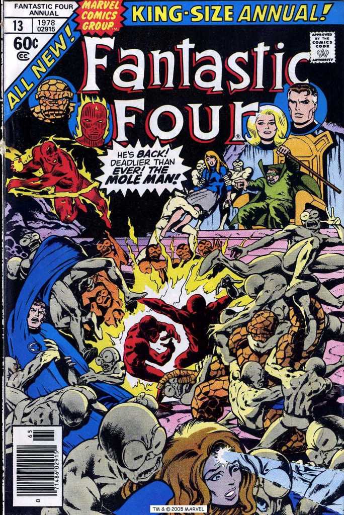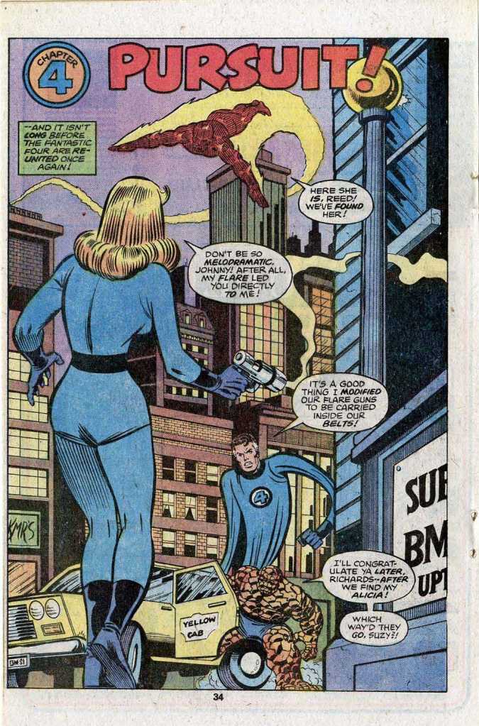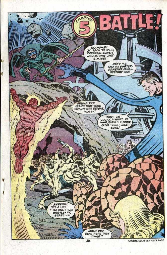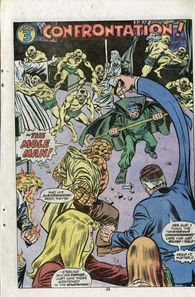 The Fantastic Four fly into action, but having learned earlier that this was the temporary domicile of his longtime enemies, the Mole Man and his minions are ready for them, and the group takes the worst of their impromptu battle. What’s worse, in the melee, the Mole Man takes off not only with the snatched statues but with their sculptor Alicia Masters as well. Only Sue realizes what is going on, and she pursues the retreating Subterraneans invisibly, following them back to eh entrance to their lair. Once she’s located that, Sue summons her partners by firing off a Fantastic Four flare signal, and they come running. There’s a bunch of fun business across this story with the FF interacting with regular people, and here, none of the heroes has the money to pay the fare on the cab that just shuttled them to the scene. Reed tells the driver to send the bill to Tony Stark–which even as a kid bothered me. Sure, Stark would pick up the tab for Avengers stuff on the regular, but this was a bit presumptuous of Reed to assume, plus how long did this poor cab driver have to fill out paperwork and wait around in waiting rooms before he was able to collect his $12.50 or whatever. And what if Stark refused to pay for it?