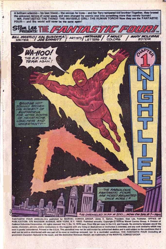 The arrival of this Annual gave me my first inkling that something was about to go wrong, although I didn’t quite realize that at the time. I bought it not at my usual 7-11 but rather at a Card Store in some other mall that my Mom had gone to for some shopping. It turned out that, for the most part, my 7-11 had stopped getting the Marvel Annuals and oversized books, at least for a time–a situation that would hold dire consequences for me in the days to come. FANTASTIC FOUR was my favorite comic at the time, though, so finding this Annual in the wild unexpectedly was like getting a special bonus. This was I believe the first Marvel Annual that I ever purchased, and so it probably seems even better than it was to me.