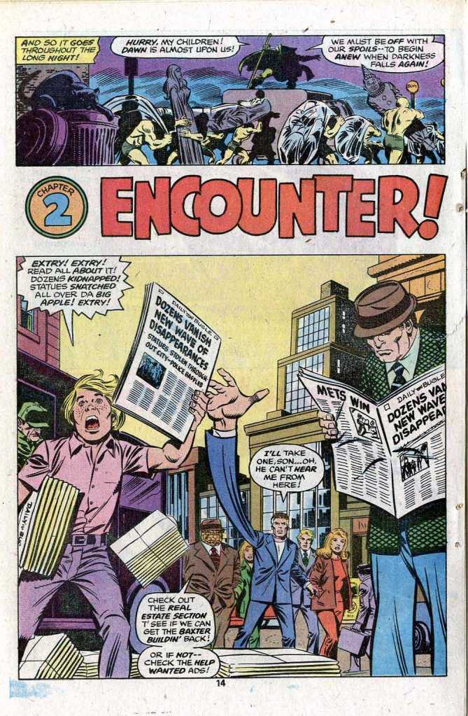 The story in this Annual was written by journeyman writer Bill Mantlo, and it was one of his better yarns. The artwork was delivered by the always-dependable Sal Buscema, his game raised by the stellar inks of Joe Sinnott. In the opening pages, the Fantastic Four are celebrating being back together once again, and Alicia Masters gifts the FF’s mystic nanny Agatha Harkness with a statue of Agatha in her youth. But there’s a wave of statue-thefts taking place all across Manhattan, and as the FF leave their makeshift apartment to get dinner, it’s burgled by the sneak-thieves. The criminals are only stealing statues of ugly subjects, though–and they’re also carrying off any especially unattractive people they encounter.