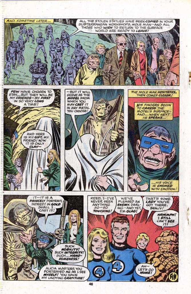 It seems that what the Mole Man has been doing here is building a place of refuge for others like himself–Moley became a super-villain after he was shunned by humanity due to his own ugliness. So he’s been recruiting others like himself through what the newspapers reported as abductions, and he’s been filling this makeshift land with objects of great beauty. Alicia has already agreed that he can keep all of the statues they took from her, and she’s even sculpted a princely statue of the Mole Man himself. And so, the FF depart peacefully, and the threat of the Mole Man appears to have been extinguished, as he’s been given that which he most desired. Of course, this being a Marvel book, the Mole Man would return on innumerable occasions, his redemption and epiphany in this story often overlooked. But such is the way of the comic book world. As a reader, I thought this story represented the end of him as a recurring threat, and I found that cool, given that he dated back to the first issue of the title.