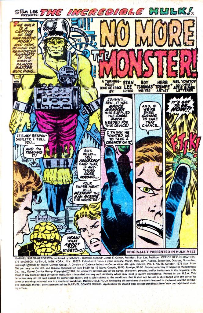 As usual, I also picked up this issue of MARVEL SUPER-HEROES, the regular reprint series that dusted off stories that had appeared in INCREDIBLE HULK a few years earlier and put them in front of a contemporary audience. Marvel kept up a full reprint line for most of the 1960s and 1970s, with these earlier stories providing some additional revenue and shelf space for the company (especially in the era in which there were no reprint payments for creators, a situation that had been rectified by the time this issue came out.) That’s a new cover by artist Herb Trimpe, and looking at it now, my eye is drawn to the two tangents with the logo–the arrow on the left and the Hulk’s shoulder. As art director, John Romita was a fiend for pointing these out and keeping them from getting into print, so this must have been a cover that he missed along the way.