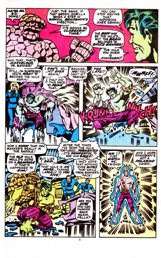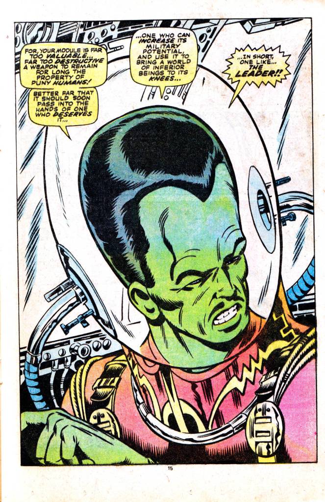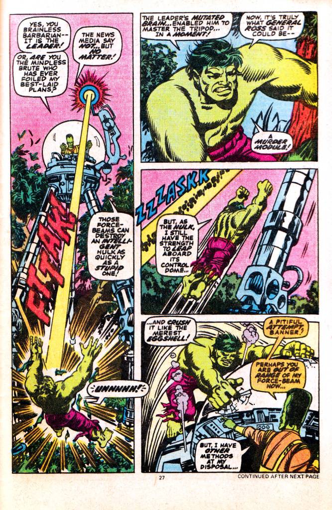 This is one of my favorite (all-time) issues of Hulk. I love Trimpe’s pencils on it and the colors just pop here. I always thought of the Leader in this way — he’s a super-smart guy because of the gamma, but he’s not Reed-Richard, Bruce-Banner smart enough to make his own Murder Module, so he takes stuff from others to pursue his plans. So the big head is really more “big ego” than “big brain”. I think Peter David and others have made him out to be a super-intellect — and Al Ewing amped all that up where he’s some transcendent being. The Leader is best when he’s a super-conniving jerk who takes the creative achievements of others, and pretends that he’s the best person to use them.