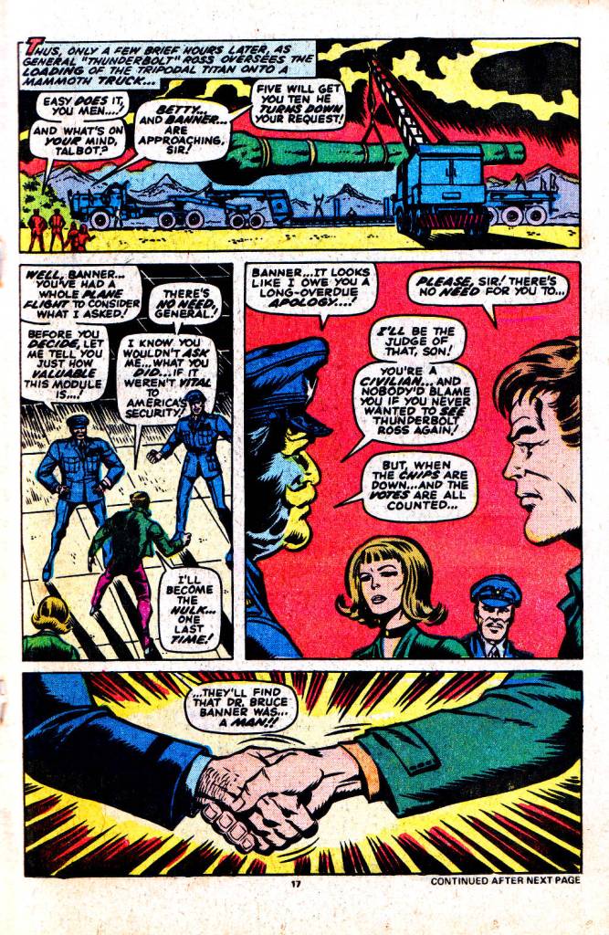 Elsewhere, the military has completed work on a new weapon, the Tripodal Observation Module, or T.O.M. for short. But the thing has another name as well: the Murder Module, and the gamma-enhanced Leader wants it for himself. Realizing that he’s going to need extra security to transport the thing to its eventual destination, General Thunderbolt Ross does one of his typical 180 degree turns and asks Bruce Banner–whom he has hounded as the Hulk and hated as his daughter’s boyfriend–to go along to safeguard the delivery. Wanting to cement good relations with the man who’ll soon be his father-in-law, Banner agrees to ride along as a guard.
