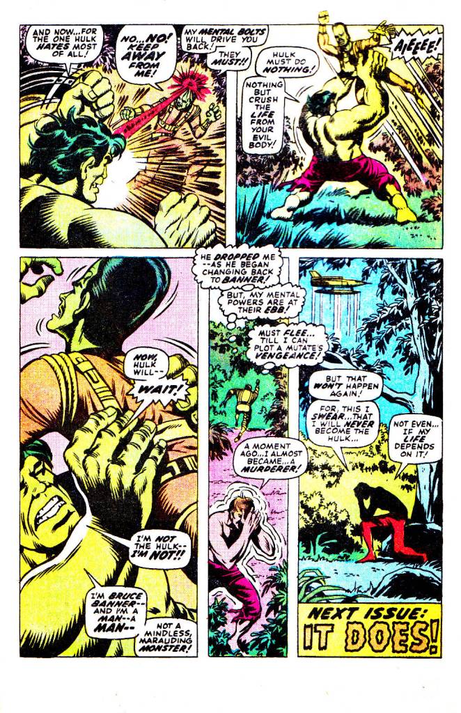 Unfortunately for the Leader, as he presses his attack, driving his foe to the edge of death, the Hulk begins to fight back, his savage persona beginning to break through the veneer of Banner’s dry intellect. The savage Hulk has no problem annihilating whatever the Leader can throw at him, and he obliterates the Murder Module, and is seconds away from crushing the Leader himself into paste before Banner’s intellect reasserts itself and he’s able to stop himself short of murder. As the issue closes, the Leader runs off for his life, while Banner realizes that his Hulk persona is not so easily sublimated, and so he can never become the Hulk again! To Be Continued! It’s pretty clear from this story that the Hulk with Bruce banner’s brain isn’t going to be a long-running status quo, but rather a condition that will only last for a story or two.
