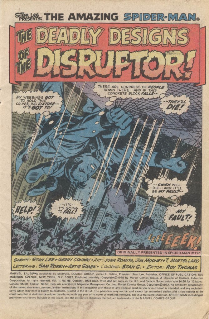 As Peter rejoins Gwen Stacy and Mary Jane Watson in the aftermath of the collapse and the trio heads for home, elsewhere a cloaked figure rails against the fact that Raleigh’s supporters survived. This is the Disruptor, who has it in for Richard Raleigh for reasons unknown. Undaunted, he makes his way to a basement laboratory where his underling Professor Thraxton is making the final adjustments to his powerful creation: the Smasher! An ordinary thug transformed through genetic modification into a colossal, unstoppable monster. Spider-Man had already danced with the Smasher once, at the start of this three-parter, but now that the wall-crawler has interfered directly with the Disruptor’s designs, he’ll be targeted aggressively for elimination.