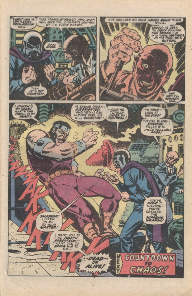 In that meeting, blabbermouth Jameson lets slip to Raleigh that Joe Robertson is digging into the candidate’s past–which is news enough to propel the Disruptor into moving up his timetable. Which doesn’t really make a lot of sense in this revised story, to be honest. If the Disruptor wants to bring down Raleigh’s campaign, then Robbie’s efforts are aligned with his own interests. Whereas in the original version, when Raleigh himself was simply a bad guy, Robbie needed to be silenced before he could reveal something compromising about the candidate. Anyway, the issue wraps up with pretty much a reprieve of the scene we got at the center of the issue, with the Disruptor going down to his basement lab and where Thraxton tells him that the Smasher is pretty much ready to go! And that’s where this issue is To Be Continued. In all honesty, it’s not a great story, and the assorted alterations, while they do make the overall tale better, seriously hurt this as a single chapter. I can remember finding it an unsatisfying read.