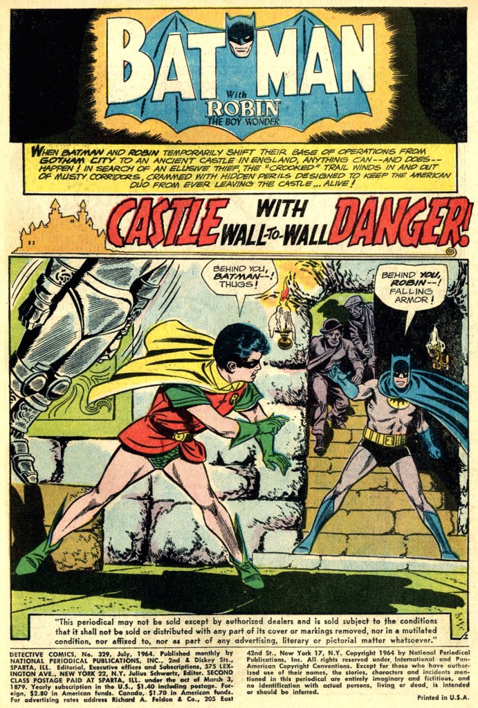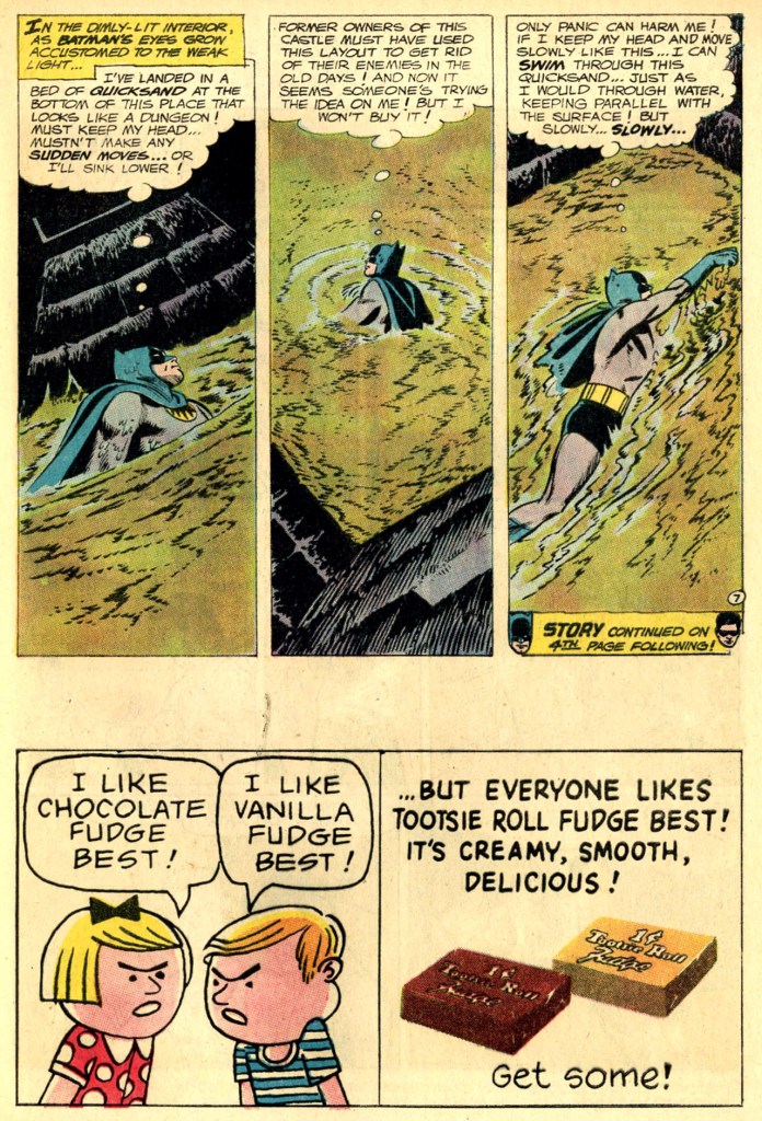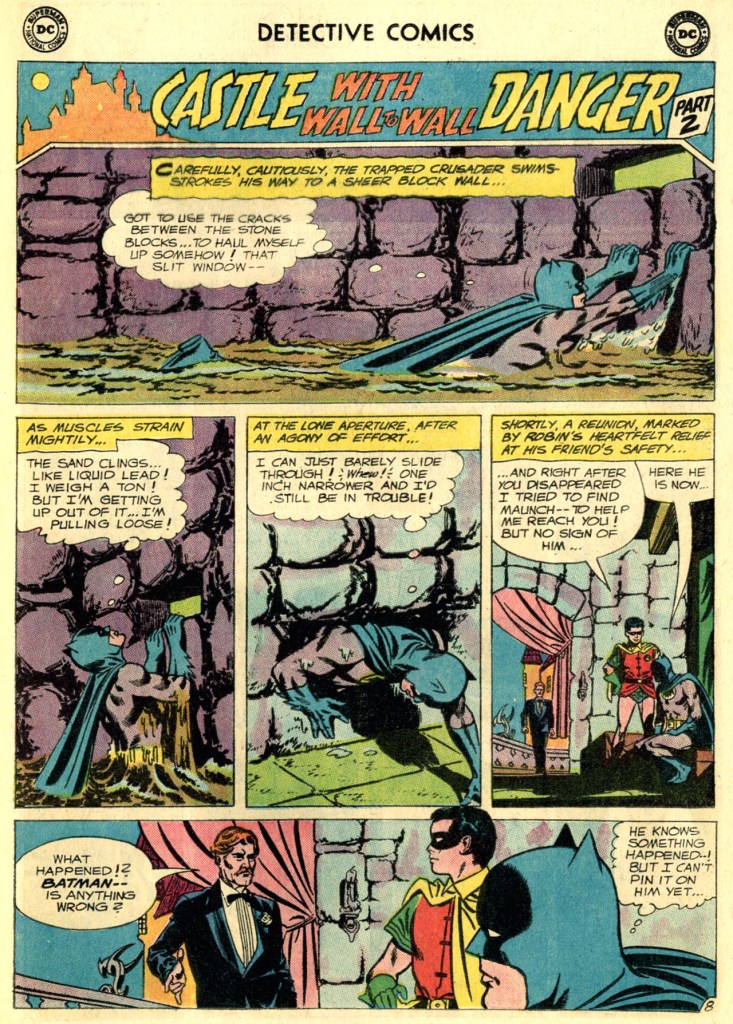 This particular issue featured only the second story that Infantino drew since taking on the series, the first being the actual refresh issue #327. It was written by Schwartz’s favorite writer, John Broome, and inked by Schwartz go-to inker Joe Giella. In it, Batman and Robin get a tip-off from Commissioner Gordon concerning the whereabouts of a criminal who had eluded them in the past. He appears to be camped out in a castle in England, so the Dynamic Duo cross the ocean in their Batplane in order to extradite the man and bring him to Gotham City justice. But when they arrive, the owner of the castle turns out to simply have a strong resemblance to their prey. Invited to stay over after their long journey, Batman finds himself plunging through a trapdoor into a quicksand bed as the pair traverse the castle hallways.