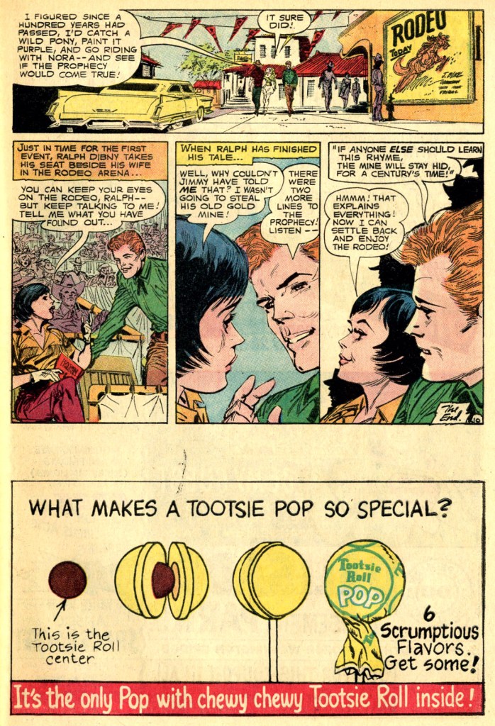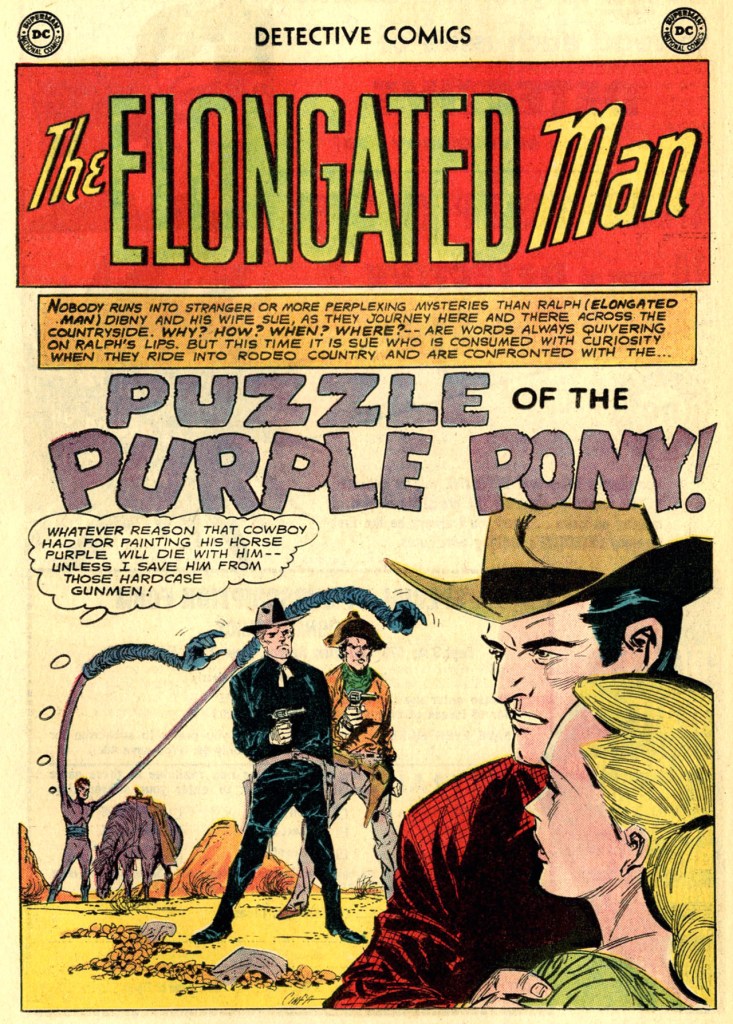 This particular installment was written by Gardner Fox, and it involves Ralph Dibny and Sue catching sight of a cowboy capturing a wild horse and painting it purple for some reason. Intrigued by this development and wondering what’s behind it, Sue dispatches her elastic husband to investigate and come back with the answers. The truth involves the quest for a lost mine and a prophesy that says that only the rider of a purple horse will be able to locate it again. The Elongated man helps the cowboy and his girlfriend to do just that, and gets to knock the heads of some claim-jumping owlhoots together while he’s at it. The stakes are low, but the story is unremittingly pleasant. And Carmine has a unique way of depicting Ralph’s elasticity that is very clever and innovative.