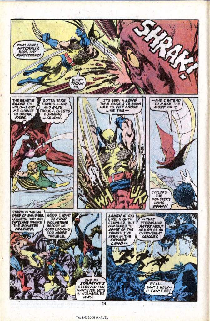 So what’s going on? Well, last issue, the X-Men were all trapped inside Magneto’s secret base in the heart of a volcano when the place collapsed in on itself. Phoenix was able to get herself and the Beast to safety, but they were stranded in the snowy tundra–and the rest of the X-Men appeared to be dead. At the beginning of this issue, Jean and Hank are able to send up a flare that attracts a rescue for themselves as the story begins. Elsewhere, it turns out that the X-Men survived by combining their mutant gifts, and have successfully tunneled back to the surface. They wind up emerging in the Savage Land, an area established in a much older X-MEN comic wherein prehistoric dinosaurs and the like still existed–a land out of time. But it’s warm and it’s better than being buried, so the X-Men are happy to have it. But it’s a dangerous place, and almost instantly, Banshee is snapped up in the jaws of a passing pterodactyl.