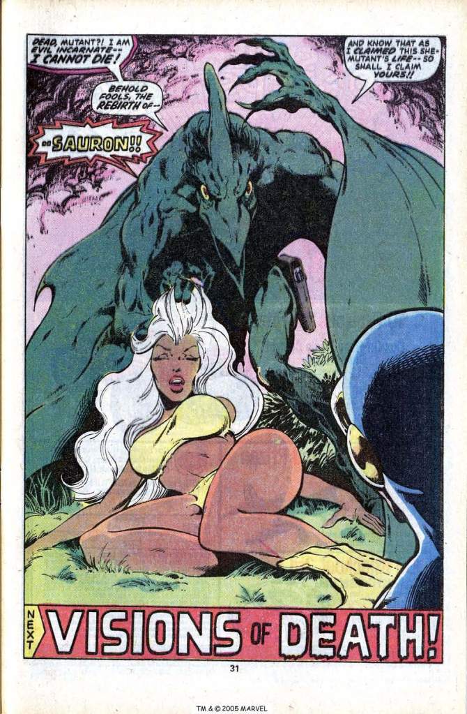 But we’re getting to the end of the issue, so it was time now to ramp things up a bit. Remember that shadowy guy from earlier? Well, he comes upon Storm swimming by herself and proceeds to grab her, sucking the mutant energy right out of her and beginning to transform himself. As the X-Men race up in response to Storm’s outcry, they are stunned to find themselves face-to-face with an old foe from near the end of the original X-MEN series: Sauron, the energy vampire! To Be Continued! Except not for me–as I’ll write about once we get there in greater length, for some reason, by 7-11 never got any copies of #115, the subsequent issue, and it was a painful gap in my collection for some time. Eventually, I wound up finding a copy at Port Comics some years later–and I broke my own rule in that I paid $5.00 for it, that being beyond the limit of what I’d shell out for any comic. Having crossed that Rubicon, it became easier to do so again in the future. X-MEN back issues in this time were valued way above any other contemporary series as more and more readers caught on to the title, because the back issues weren’t plentiful. Five bucks for a comic book that I could have, and should have, bought off the racks was unthinkable to me, an absolutely large sum of money in those days.