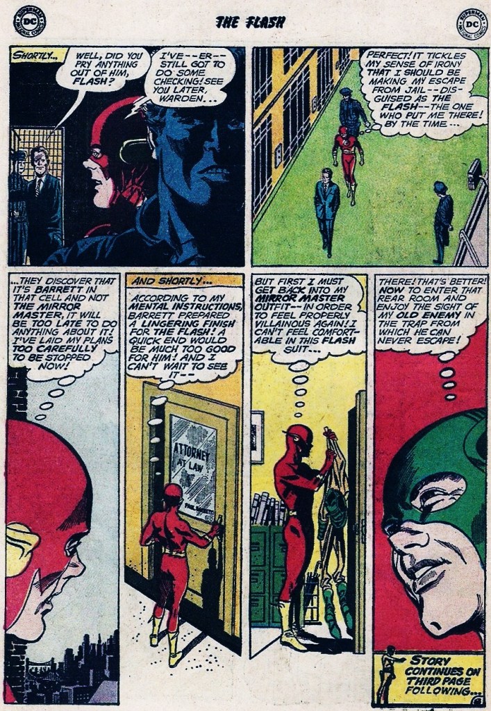 Unfortunately for the Mirror Master, this story opened with a sequence in which Barry Allen gets a tooth filled, and his filling hasn’t yet settled in. So the Flash is able to dislodge it from his tooth and then spit it across the room with such velocity that it shatters a key vacuum tube of the apparatus keeping him prisoner. From there, it’s a simple matter for the Crimson Comet to race across Central City, locate the Mirror Master in the midst of his next heist, and render him back behind prison bars, his plans foiled. And the story ends with Barry getting that lost filling replaced–because good oral hygiene is paramount.