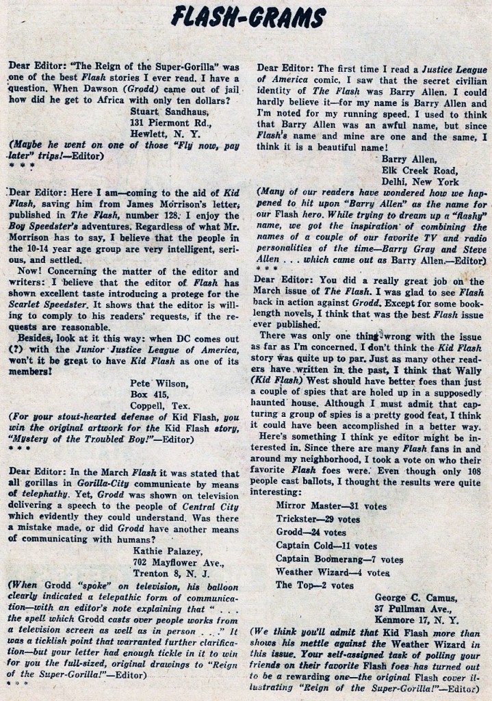 Next came the Flash-Grams letters page overseen by editor Julie Schwartz, although he was still using an anonymous editor sign-off. As you can see, by this point Julie was encouraging reader participation in the page by awarding letter writers whose correspondence got printed the original artwork to the stories from the issues in question. While this seems just a little bit crazy, it did save a lot of this art from being destroyed, as was DC’s custom at the time, so that’s good. This practice didn’t last for all that long as a I recall, just a year or 18 months or so. But it definitely did its job and god fans, especially the older fans, writing in.