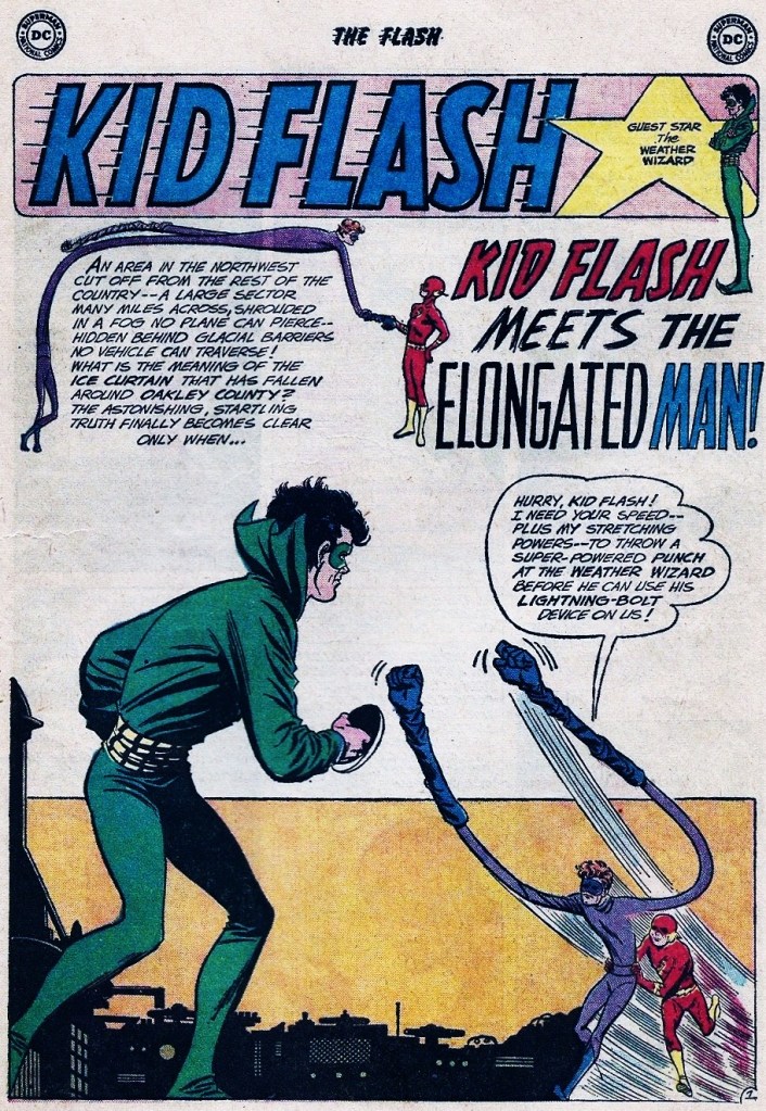 The story involves Kid Flash being dispatched on an errand by his mentor, who is about to go on vacation (to make an appearance in an issue of GREEN LANTERN, it turns out.) Kid Flash’s task is to answer a request for assistance from Barry Allen’s old friend the Elongated Man, who has come across another mystery in his travels across the nation. It involves some strange weather occurrences, and so it’s no real surprise when the culprit turns out to be the Flash’s old enemy the Weather Wizard (who fortunately wasn’t among the costumed criminals shown to be behind bars in the opening story.) Wally and Ralph are able to combine their superhuman talents to defeat the Weather Wizard and take him in.