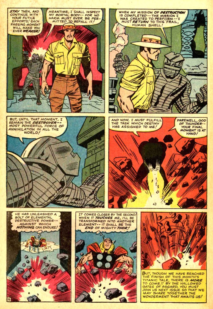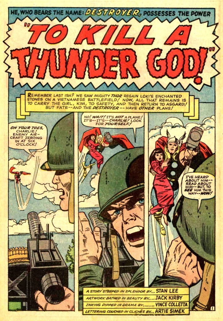 Back on Earth, Thor is in deep, deep trouble. Not only does the Destroyer posses a dazzling array of innate abilities, not only is he impervious to even the strongest of blows, but he can also pick up Thor’s hammer thanks to being similarly enchanted by Odin–and even damage it. At an unbelievable moment, an energy beam from the Destroyer slices right through the hammer, cleaving it in two and rendering it useless as a weapon. So Thor must continue the struggle bare-handed. Ultimately, the Destroyer succeeds in trapping Thor by embedding him within the floor itself–and then it unleashes powerful destructive energies at him, to finish him off. It’s at this point that the adventure is To Be Continued!