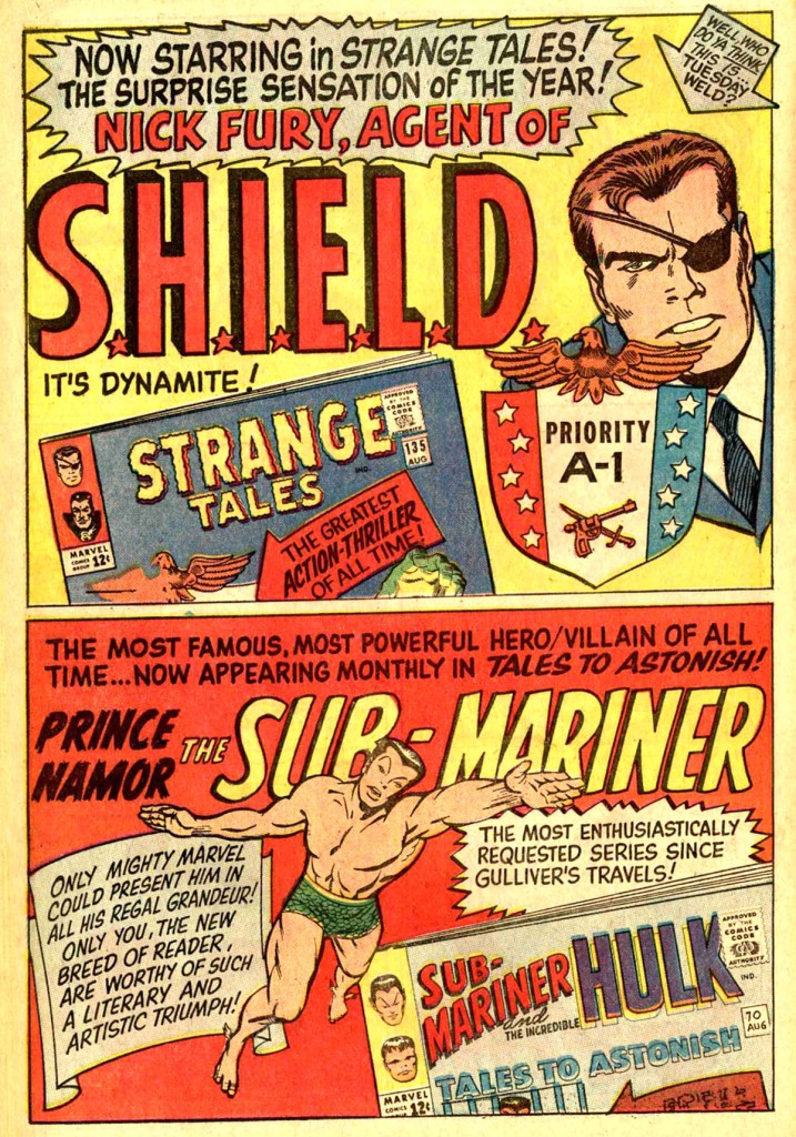 A quick pit stop at this point for a House Ad touting the big series changes happening in two other of Marvel’s super hero anthology titles. In STRANGE TALES, the Human Torch has been evicted in favor of Nick Fury, Agent of S.H.I.E.L.D. which is cast in the mold of the spy thrillers that were all the rage in the mid-60s. And Giant-Man, too, is gone, ejected from his spot in TALES TO ASTONISH. In his place is Prince Namor, the Sub-Mariner, one of the most popular anti-heroes of the early Marvel era. Him getting his own series again was big news as well.