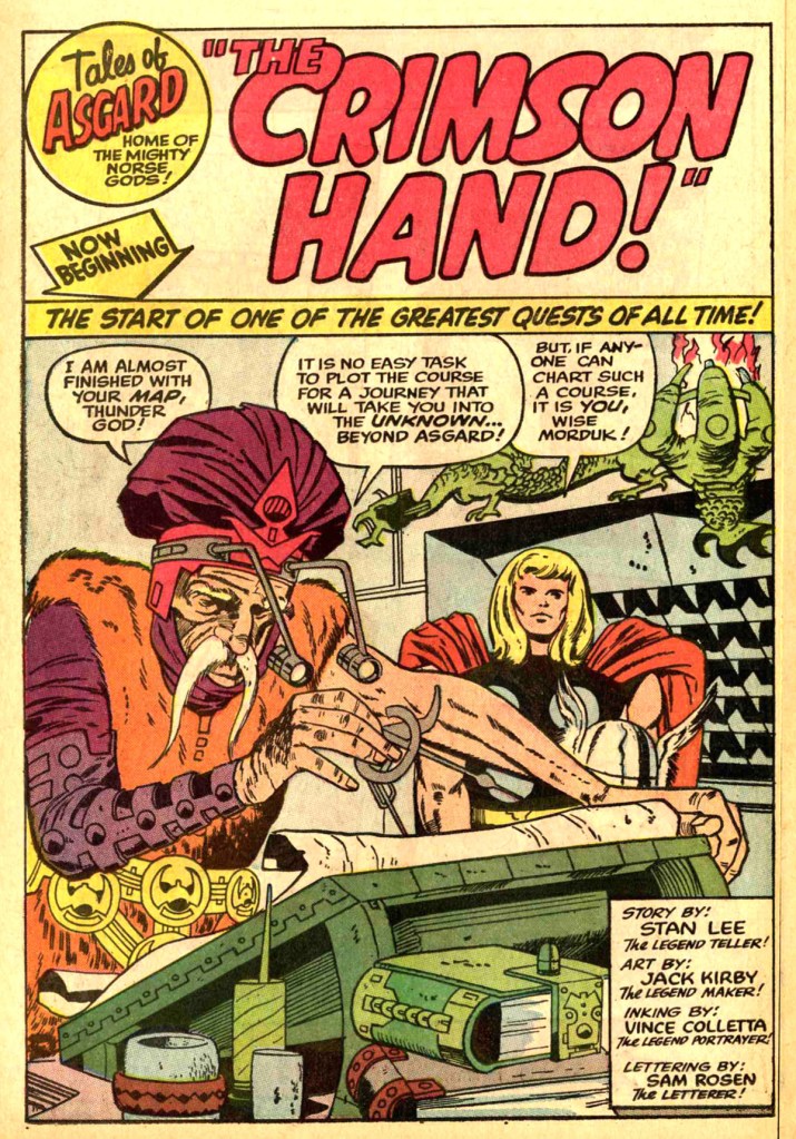 In this installment, having discovered that the potentially world-ending Odinsword had been damaged, Thor has been dispatched to gather a crew and seek out whatever sinister power may lay behind this act. The mystic Morduk presents Thor with a Crimson glove that compels those grasped by it to tell the truth, so that he may test his new recruits before accepting them for the mission. As expected, Loki has secreted potential betrayers among them, but none can get past the revelatory power of the Crimson Hand, and so they are ejected from the party. But Lokl recognizes the power that Thor is facing, and finds an excuse not to clasp hands with his brother. With his compliment now free of hidden betrayers (apart from the obvious Loki), Thor sets sail on his awesome mission. To Be Continued!