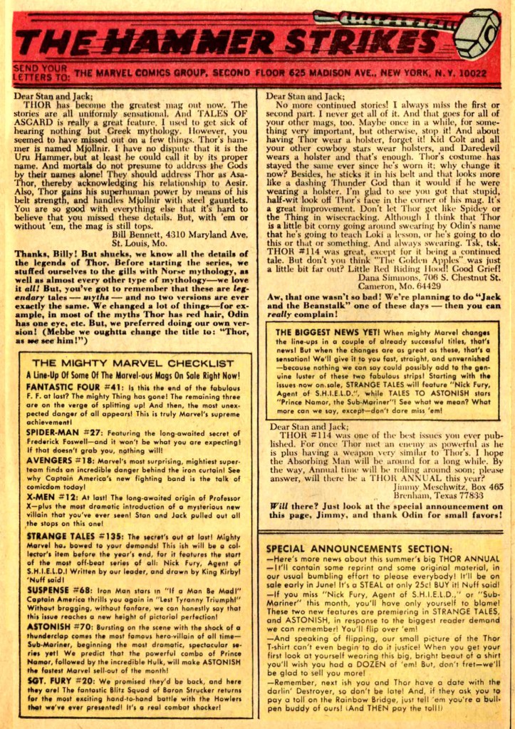 Because JOURNEY INTO MYSTERY used up an extra page on story between the 16 page Thor lead and the 5 page Tales of Asgard back-up, its letters page The Hammer Strikes was only a single page in length, and thus quite cluttered with information and sell-copy. But this was a small price to pay for additional story content. This particular page spends a lot of energy hyping the two new series, Nick Fury and Sub-Mariner, making them out to be the most exciting developments of the Marvel Age. And they were–at least until the next developments came along!