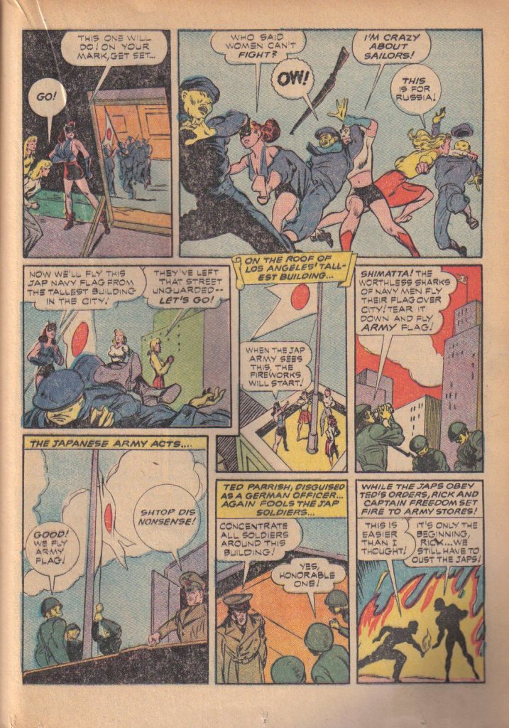 In this particular story, though, the Black Cat was facing a situation much too large for her to deal with herself: a full-fledged Japanese invasion of Hollywood! Consequently, as the scope of the situation became apparent to her, she radioed for help from most of the title’s other headline characters; Captain Freedom, Ted Parrish, the Girl Commandos (led by Pat Parker) and Shock Gibson. Upon receiving Linda’s broadcast, the assorted champions race to teh battle in Hollywood.