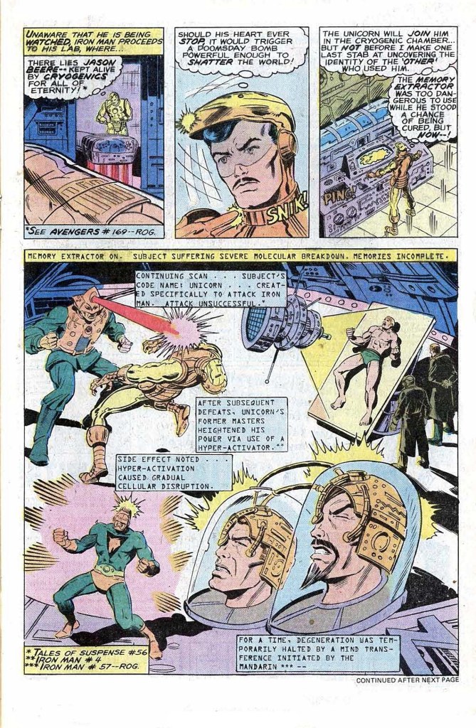 As the issue opens, the Avengers are finishing the task they’d shown up to do last month before the attack of Arsenal: transporting Iron Man’s defeated foe the Unicorn to where he might get medical attention. Iron Man in particular is interested in who saved the Unicorn and sent him to destroy Tony Stark’s company, so the Armored Avenger hooks his foe up to a memory extractor, and we are treated to a series of flashbacks to both older issues and new in-between material. Here again, the identity of the Unicorn’s benefactor is concealed but it is obvious to any long-standing Iron Man reader. While this is going on, from afar, another figure is spying on Iron Man, working out the defenses of the place and preparing to assassinate Tony Stark. This is another plotline that Mantlo wouldn’t get to finish up, although his successors moved into it with the same overall solution.