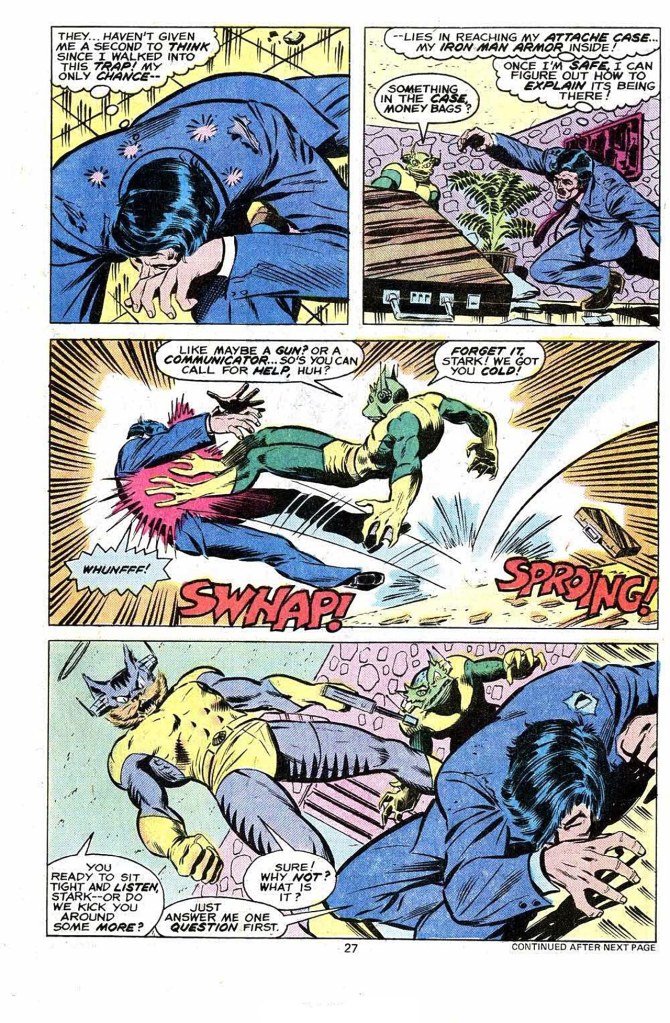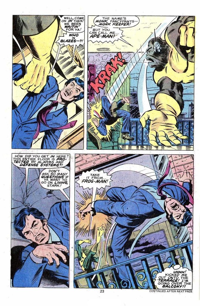 Accordingly, Tony Stark gets his ass kicked by the quartet of animal-styled villains, almost losing his life when Ape-Man accidentally hurls him over the balcony. All during the one-sided fight, Stark’s only real seeming concern–apart from surviving, of course–is the whereabouts and safety of Whitney Frost. The Ani-Men, though, prevent him from getting to his attachĂ© case and the armor secreted inside it, And without it, he’s just a regular guy. As the four Ani-Men circle him, Tony is struck down from behind by an unseen figure, the identity of which should be obvious to all simply from this description.