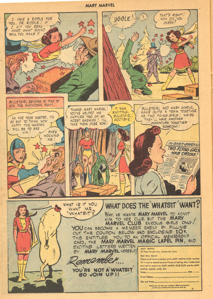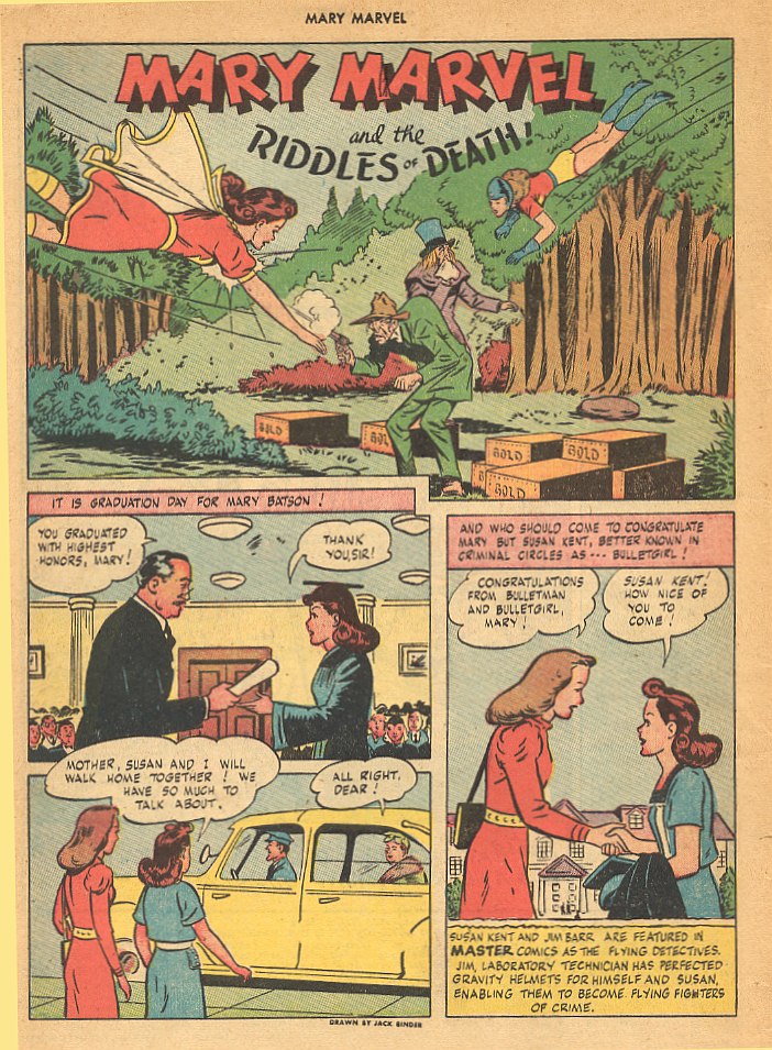 Which brings us to MARY MARVEL #8, cover dated December 1946. In the lead story in this issue, unheralded on the cover and unpromoted anywhere else, May winds up sharing an adventure with Bulletgirl. Susan had previously met Captain Marvel Junior as a member of the one-shot Crime Crusaders Club in the Minute Man story in MASTER COMICS #43 in 1943, an adventure that gets covered in greater detail here: