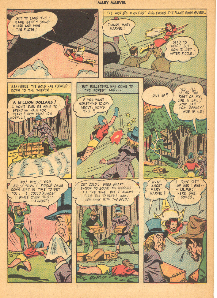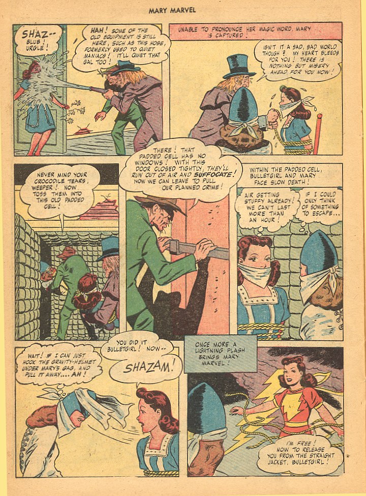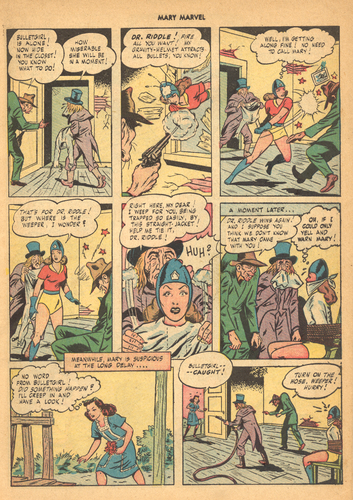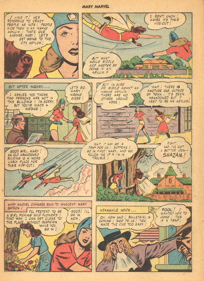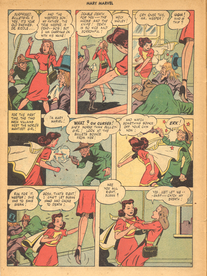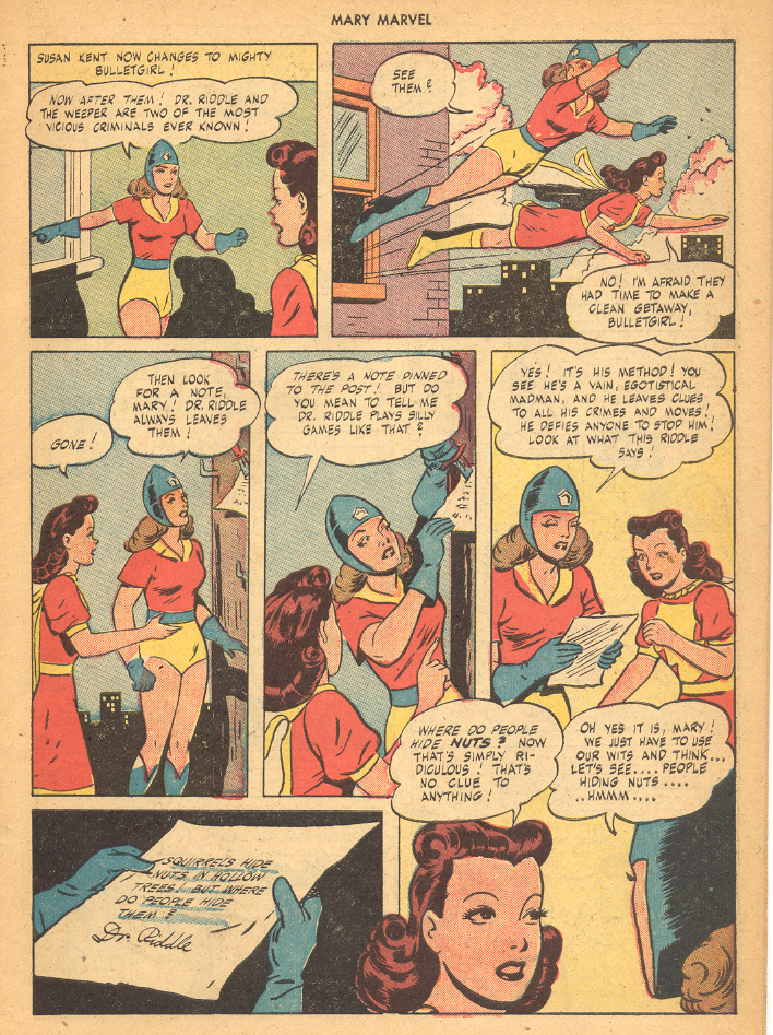 The story was written by Otto Binder, who wound up writing greater than 50% of the Marvel Family’s solo and united adventures over the course of the Golden Age. It was illustrated by his brother Jack Binder, who had operated an art shop that provided material to Fawcett and other publishers. He’s given a small byline at the bottom of the first page. The story pits the team of Mary and Bulletgirl against two of Buleltman’s recurring enemies: The Weeper (a sort of reverse Joker) and Doctor Riddle (who was the Riddler before the Riddler.)