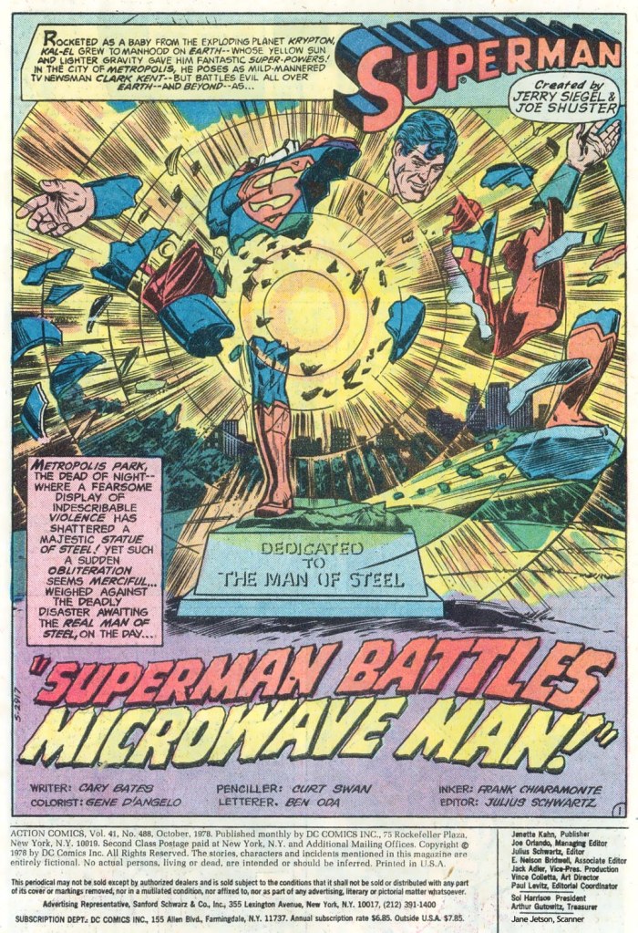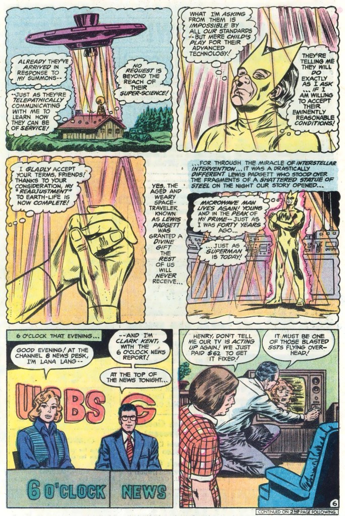 Last month, we were introduced to Microwave Man, a costumed criminal who was active in Metropolis in the days before Superman, when Perry White was still just a regular reporter. Microwave Man had gone on a crime spree some forty years ago, then vanished without a trace. But we learned that he’d contacted an alien spacecraft with his microwave apparatus, and spent the next four decades roaming the stars. Now back on Earth to retire, Microwave Man is intrigued with the possibility of challenging Superman. There’s a lot more microwave radiation in use in 1978 than there was back in the past, and so he’s potentially mightier than ever. But his old and feeble body can’t stand up to the strain of exercising his great powers. Undaunted, he contacts his alien friends, who agree to restore his lost youth to him in exchange for conditions not revealed to we readers. And so the stage is set for a super-bout.