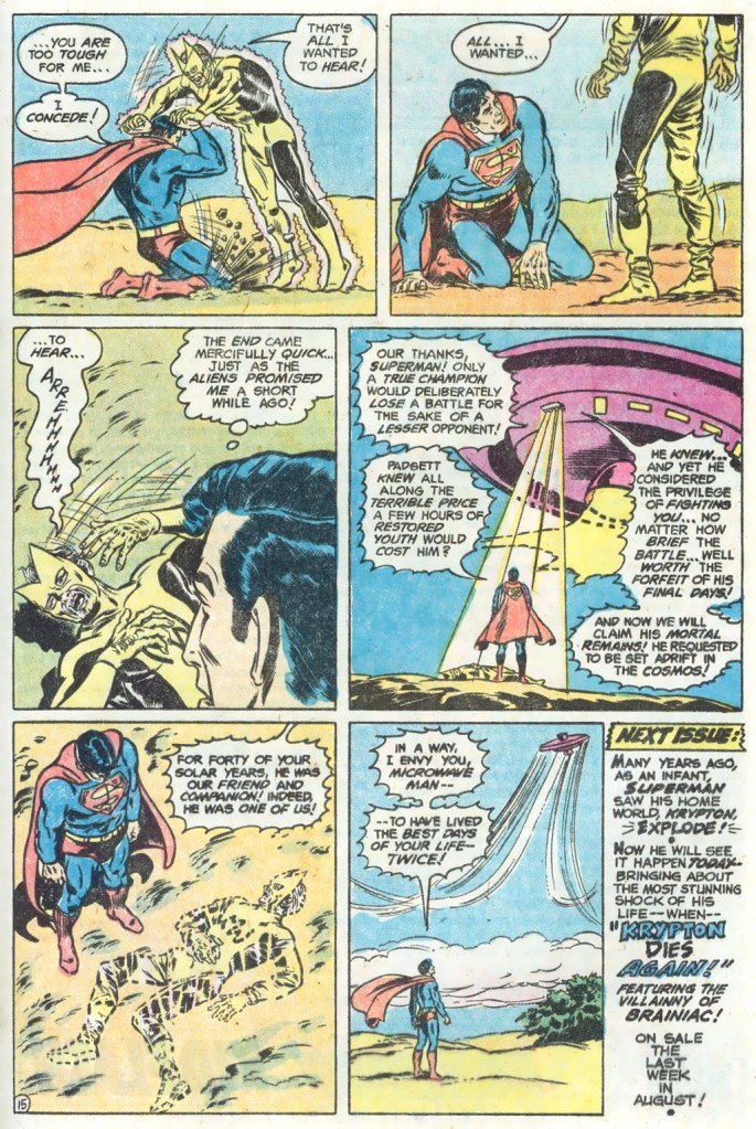 Realizing what the source of Microwave Man’s strength is, Superman prepares to rush him and fly him into the past, where there will be less microwave radiation to strengthen his foe. But before he can do so, he receives a telepathic message from the villain’s alien benefactors. So instead, Superman drops to the surface and grapples with Microwave Man, being pushed to his knees and conceding defeat. With his victory confirmed, Microwave Man lets go, and is disintegrated by his own powers, the ultimate cost of his rejuvenation. We learn too that Superman threw the fight, of course, to allow his enemy his last moments of happiness and pride. Which is pretty cool when you come right down to it. This sort of sense of self-sacrifice was something that was often on display in Superman stories (and, indeed, other super hero strips) and made the hero all the more impressive.