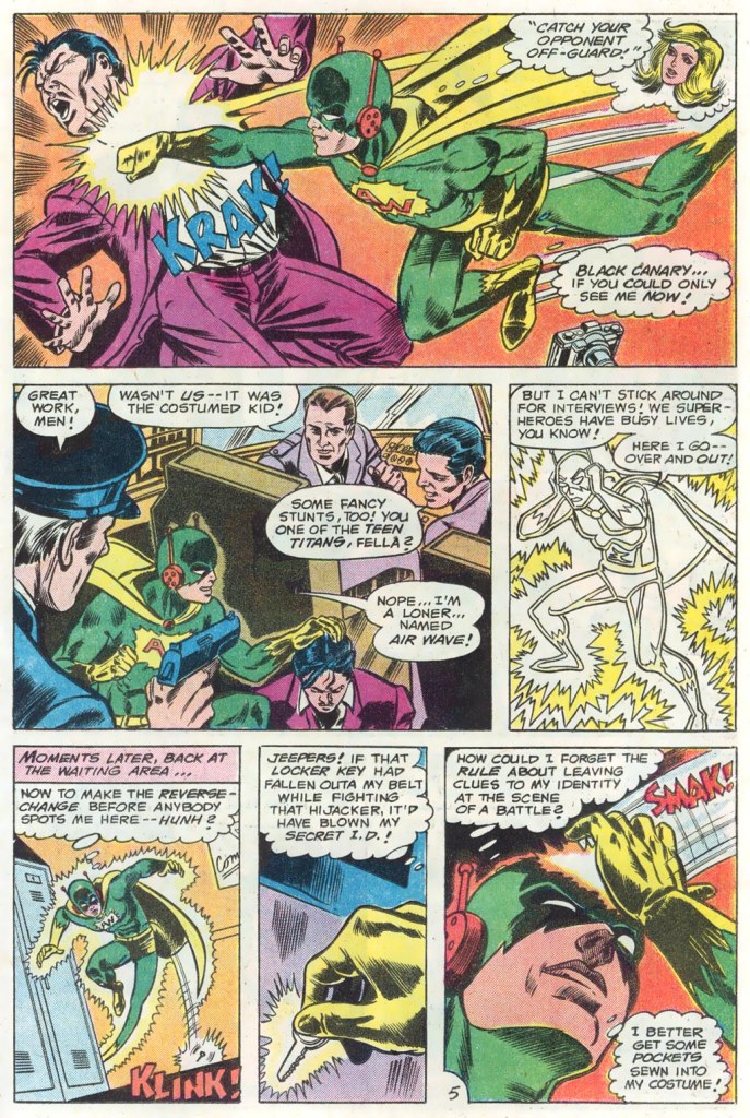 In this story, young almost-16-year-old Hal Jordan AKA Air-Wave (he’s the cousin of Green Lantern, with the same civilian name) relocates to Texas from Coast City to stay with Hal’s brother Jack and his family. Along the way, he has two opportunities to go into action as Air-Wave: the first to foil some would-be airplane hijackers and the second to defeat a weird nameless train-themed criminal who manages to escape from him. He also sets up a supporting cast for himself, spends time remembering different pointers on how to be a super hero that he’s received from Green Lantern, Green Arrow and Black Canary, and blown his secret identity to his possible love interest. All in all, it was like a lightweight, low-stakes version of the early Spider-Man, and I enjoyed it. It probably didn’t hurt that Air-Wave was a second-generation super hero, his father was the Air-Wave of the Golden Age, a genuine 1940s character.