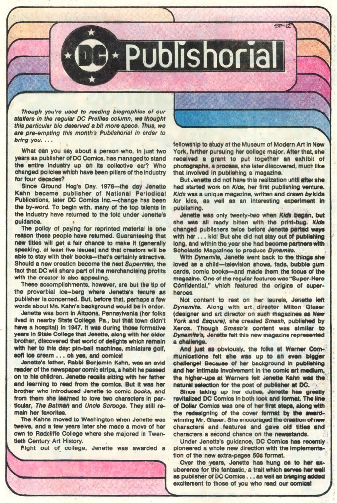This issue also includes the latest DC Publishorial, which in this instance is actually a biographical spotlight on new DC Publisher Jenette Kahn. It’s a thoroughly laudatory piece, as you’d expect, but it did provide a few more details about this person who had been writing columns for a while now. I was interested to learn that she had created DYNAMITE Magazine, a publication that I had seen and read in school through the Scholastic Book Club.