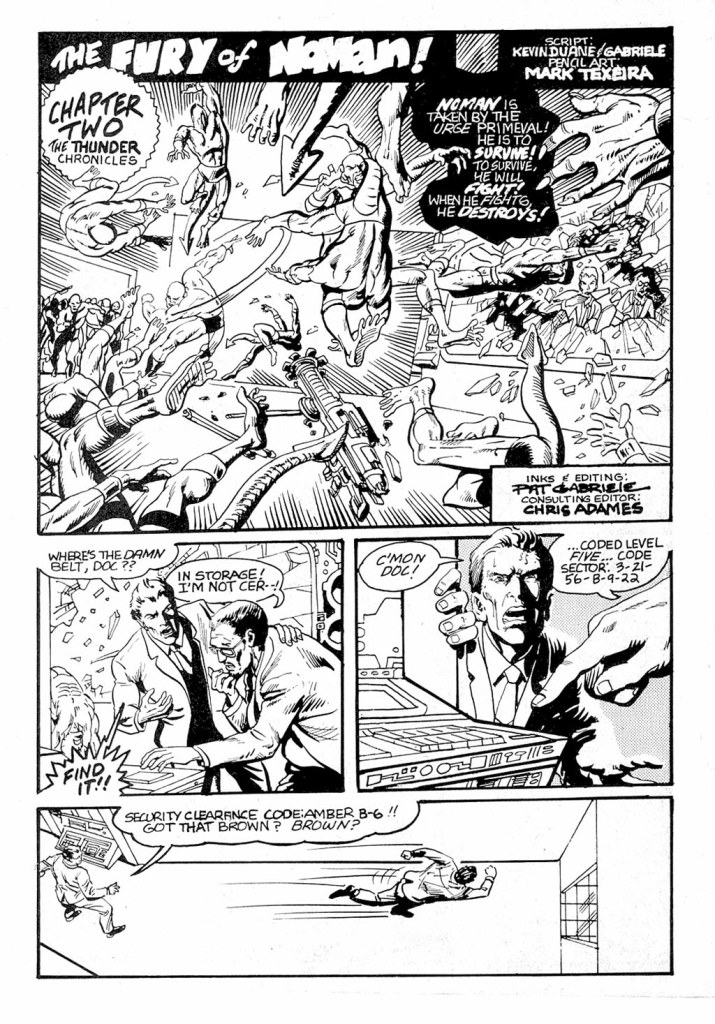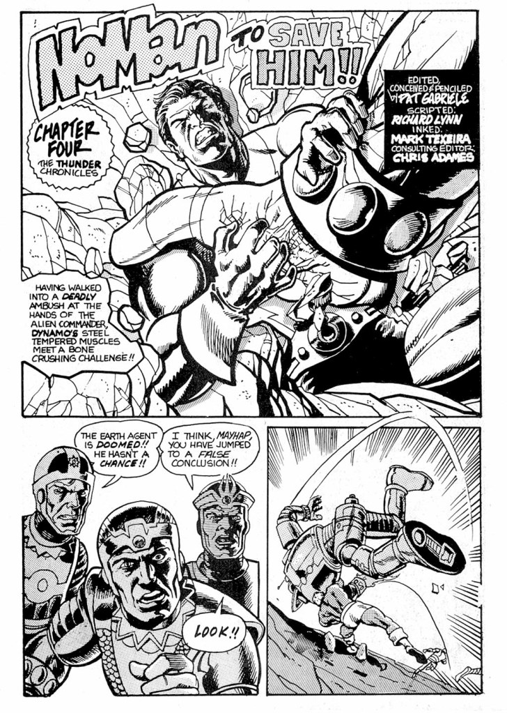 To produce the book, Carbonaro turned to a number of fans-turned-would-be-professionals who operated Richmond Studios. This included the aforementioned Mark Texeira, Pat Gabriele, Lou Manna, Chris Adamses and Kevin Duane. The plot for the issue involved a new invasion from the alien race that Dynamo had encountered in the 1960s in the first four issues of his self-titled series. Beyond that, it’s an action-heavy spectacle designed to showcase the assorted Agents characters and their individual powers and abilities. There’s not a lot of emphasis placed on characterization, and the artwork swipes from the original Wally Wood books all over the place. It’s fun, but not quite at the level of a professional product.