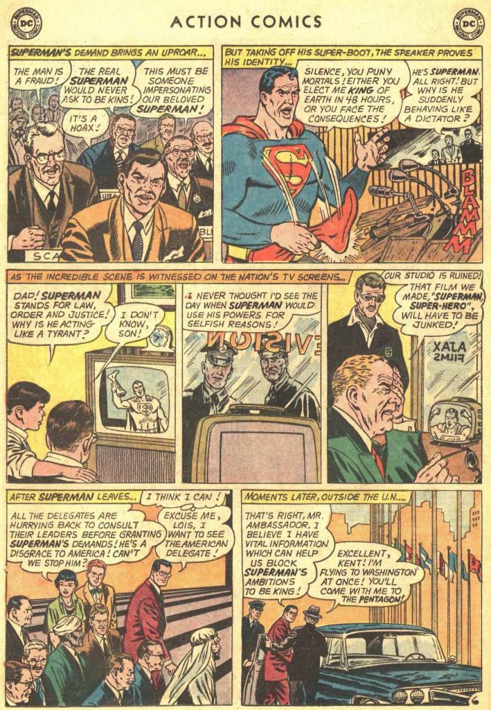 That all said, the two-part story that opens this issue, while entirely bloodless, feels as though the stakes are a bit more real than usual. Experimenting with a cure for Kryptonite while using a piece of Red Kryptonite that once split him into both his Superman and Clark Kent selves, the man of Steel creates some strange Kryptonite fumes that again split him into an evil Superman and a powerless Clark Kent, even though Red Kryptonite isn’t supposed to be able to affect him twice. Nevertheless, the separated Superman is cruel–though not so cruel that he abandons Clark to his arctic fortress. But having recently seen a tyrant king on an assignment, the malevolent Superman appears at the United nations and demands to be crowned the King of Earth.