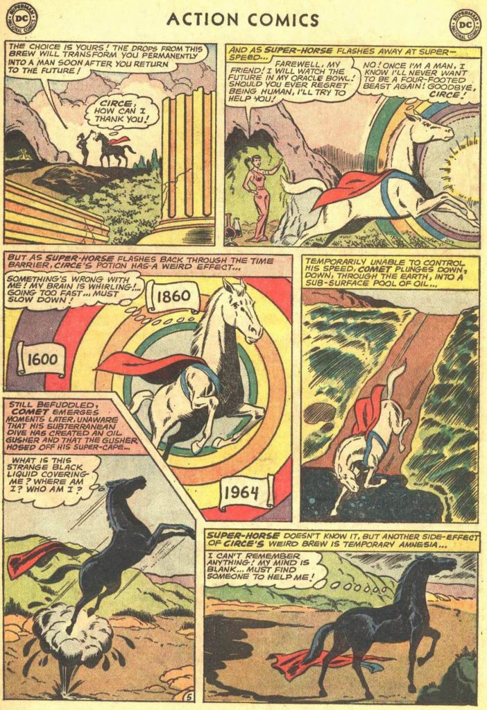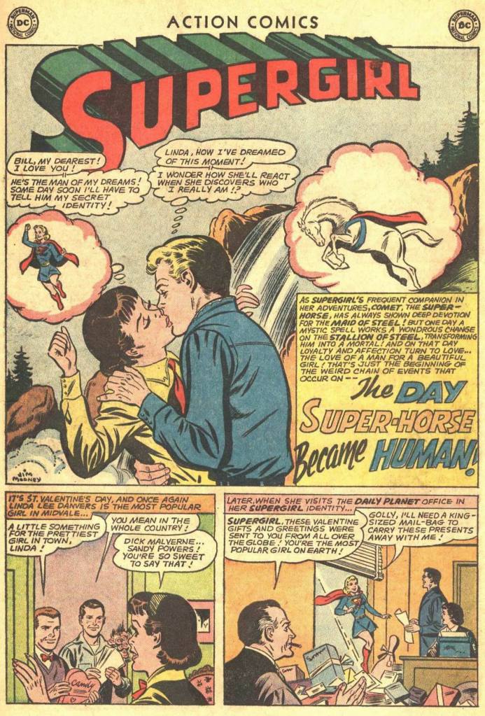 Before long, though, Super-Horse loses his powers and adopts the makeshift identity of “Bronco” Bill Starr. As Bill, he winds up saving Linda Lee’s life (or seeming to, since she’s really Supergirl and was in no danger) and is able to begin a torrid love affair with her. But Bill is mistaken by Supergirl for being the Hooded Demon, and he’s forced to flee from her. But when the pursuing Supergirl winds up stricken by some Kryptonite, as predicted Comet prays to Circe to be restored to his powerful horse self so that he can save her. By the end of teh story, Supergirl is heartbroken that “Bronco” Bill has vanished after she accused him of being a criminal, and Super-Horse is once more unable to tell her who he really is. So the status qu is maintained, but the lead characters carry emotional scars because of their experiences.