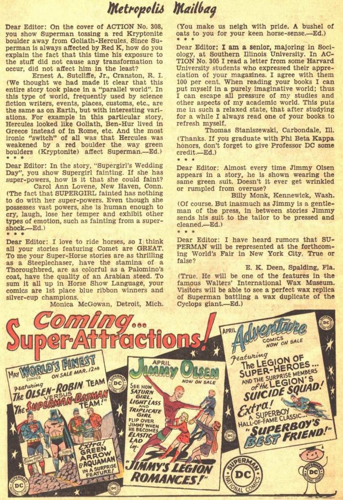 Finally, the Metropolis Mailbag letters page comes last, where it doubles up with some Coming Super-Attractions, Mort’s always effective ad-plugs for other titles within his Superman line. Jimmy Olsen and Robin join forces against Superman and Batman! Elastic Lad romances the Legion girls! The Legion’s Suicide Squad! Mort definitely knew how to make these little blurbs resonate with his audience and how to hook them into seeking out these other publications.