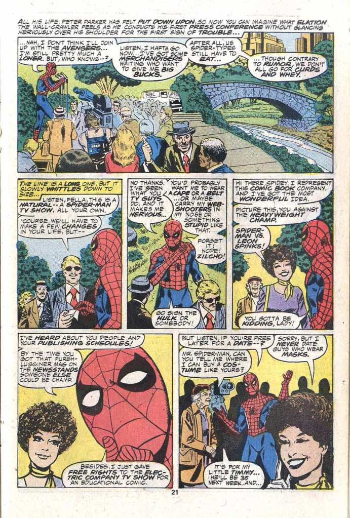 Marv Wolfman plays the press conference for laughs, even if a few of them are a bit inside baseball. He gets off a few cheap shots at the CBS Spider-Man television show as some producers approach him to be the subject of such a series. And Jenette Kahn, DC’s new publisher, puts in an appearance, offering to star Spidey in a comic book in which he’d battle Leon Spinks, a reference to the long-promised SUPERMAN VS MUHAMMAD ALI tabloid. (it looks to my eye like caricaturist supreme Marie Severin may have done some work on the Jenette faces here.) Spidey, though, has already given his comic book rights over to the Children’s Television Workshop for use on the ELECTRIC COMPANY show.