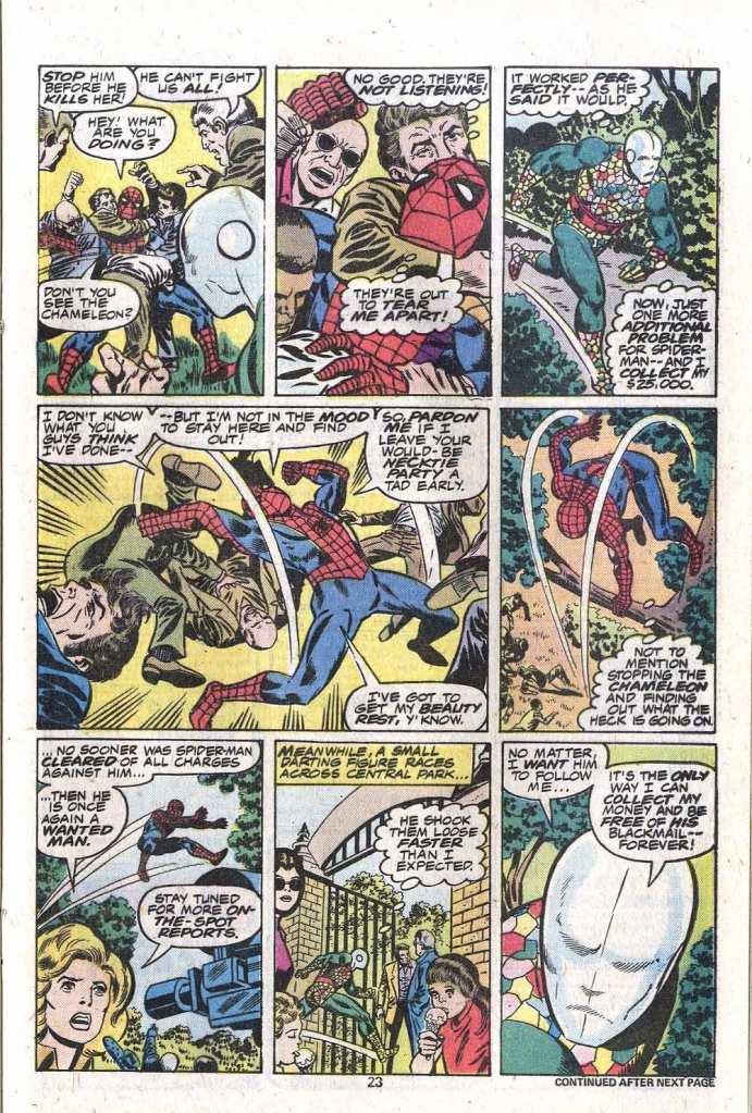 Of course, this being a Marvel comic book of the 1970s, we need to work in some big action before too long, and this comes in the form of Spidey’s old foe the Chameleon. He’d shown up earlier in the issue when he was one of the people the web-slinger saved from that burning building. But here, he’s got a new hologrammatic suit that can allow him to change his identity at a second’s notice. So when he shows up in Spidey’s line and reveals himself, the wall-crawler attacks–but to the gathered crowds, it looks as though he’s beating the hell out of an old woman. So the crowd, naturally, turns against the web-head, and Spidey needs to fight his way through them without injuring anybody, while pursuing the Chameleon through the park. You would think that Spidey could simply web up the Chameleon, but he never seems to do so here. It could be that the intent is that Spidey is out of expensive web-fluid, but that isn’t the way that Wolfman scripts these sequences, so I don’t know what was up with it all. Anyway, Spidey’s reputation is being soiled before the public once more.