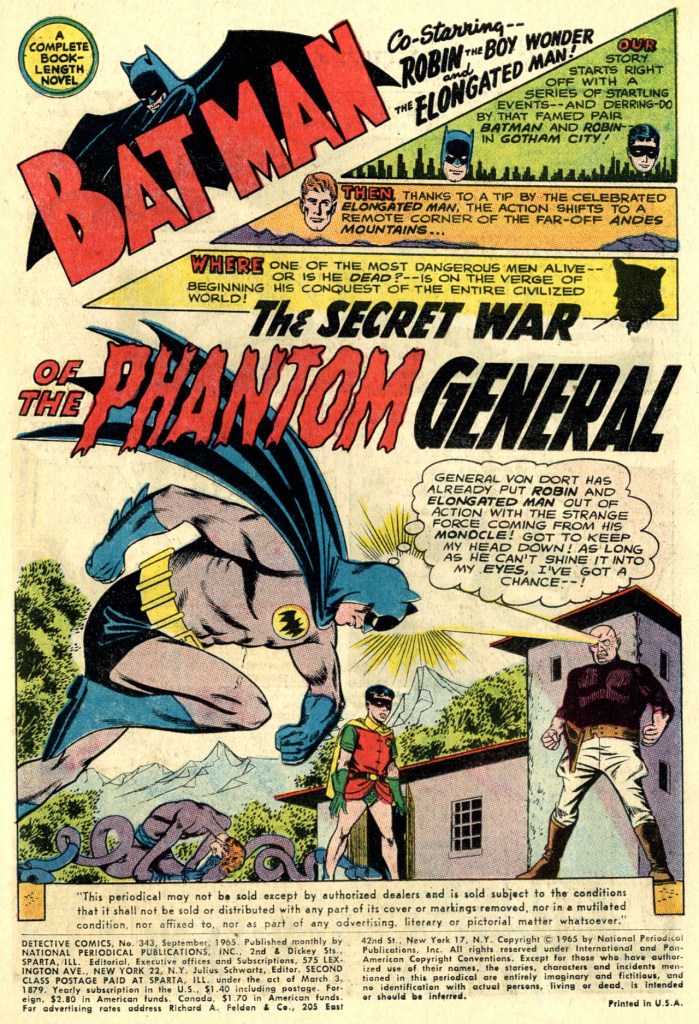 Broome rather playfully inserts himself as an occasional narrator for this story, which also allows him to get a writer’s credit for it–the Batman books in particular were loathe to indicate that anybody apart from Bob Kane was working on the feature, despite he obvious evidence. Infantino’s caricature of Broome on these pages is both spot-on and pretty funny. he captured Broome’s likeness well. The story concerns the efforts of former Nazi General Von Dort–a man believed to have been killed during the war–to organize the underworld into a crime army under his direction. Batman and Robin’s assistance is requested by Ralph Dibny after the Elongated Man becomes aware of the plot.