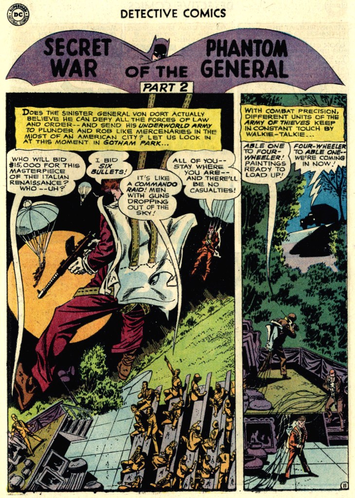 The General also possesses a monocle that can sap the will of men, and so he has little challenge in assembling his underworld army. But when he puts it into operating to loot Gotham City, Batman and Robin are there. There’s one ridiculous moment in this story where the Dynamic Duo come swinging in on bat-lines to confront invaders in the equivalent of Central Park–leading one to wonder what in the world their lines could have been anchored to? Anyway, the Caped Crusader puts a stop to this raid, but it turns out the entire thing was a feint, a ploy to allow Von Dort to steal away with his actual objective unmolested.