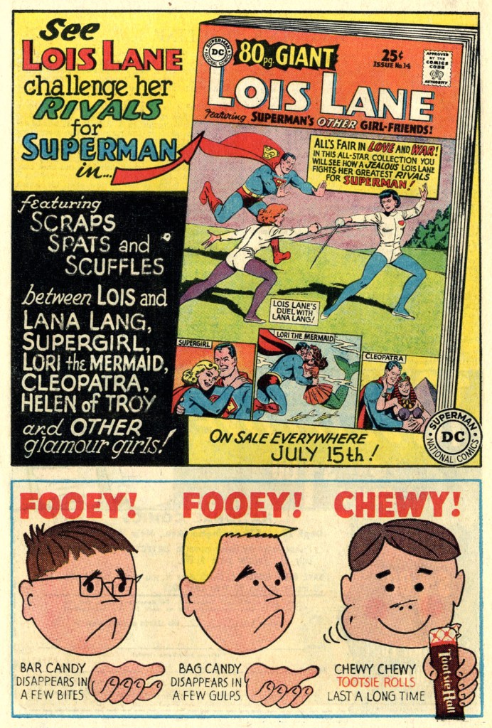 This is followed up by a 2/3 page House Ad for a particularly catty LOIS LANE 80 Page Giant. DC’s editors tried to give each of these releases a theme but this became more difficult as time went on and so many options had already been done. It’s a fun Kurt Schaffenberger cover, though one that somehow feels as though it would have been more at home on an issue of CAPTAIN MARVEL a decade earlier.