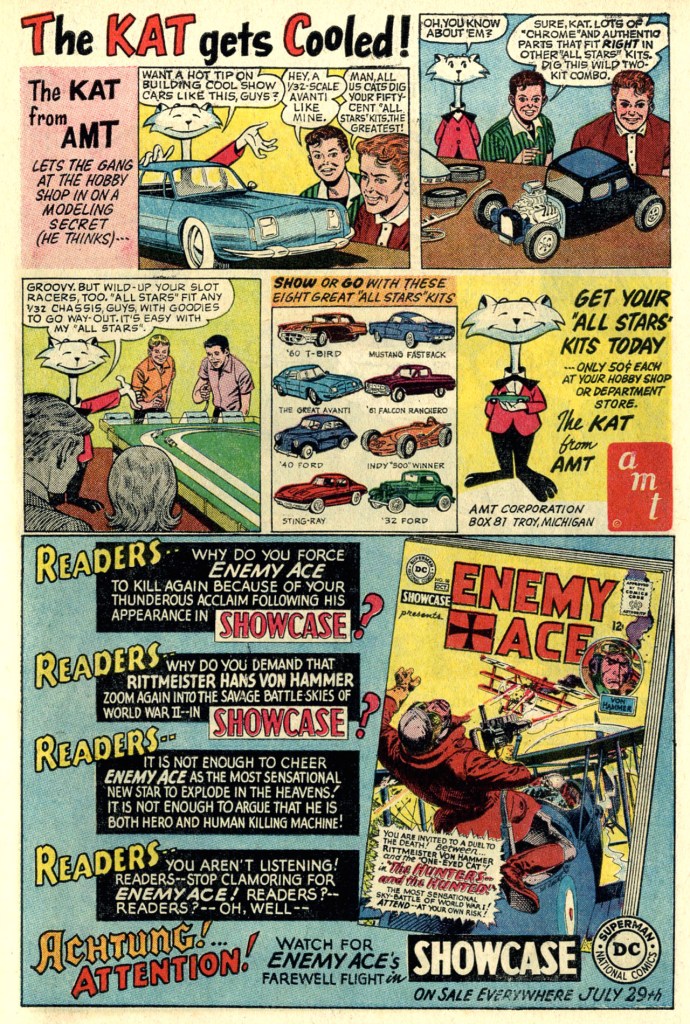 And one more dramatic House Ad before we get back to the action, this one plugging ENEMY ACE’s appearances in SHOWCASE. He’d started out as a back-up feature in STAR-SPANGLED WAR STORIES and this was an attempt to see whether he could carry his own series. The answer wound up being that he’d take over SSWS as the cover feature for a good while. The typography here was likely done by Ira Schnapp.