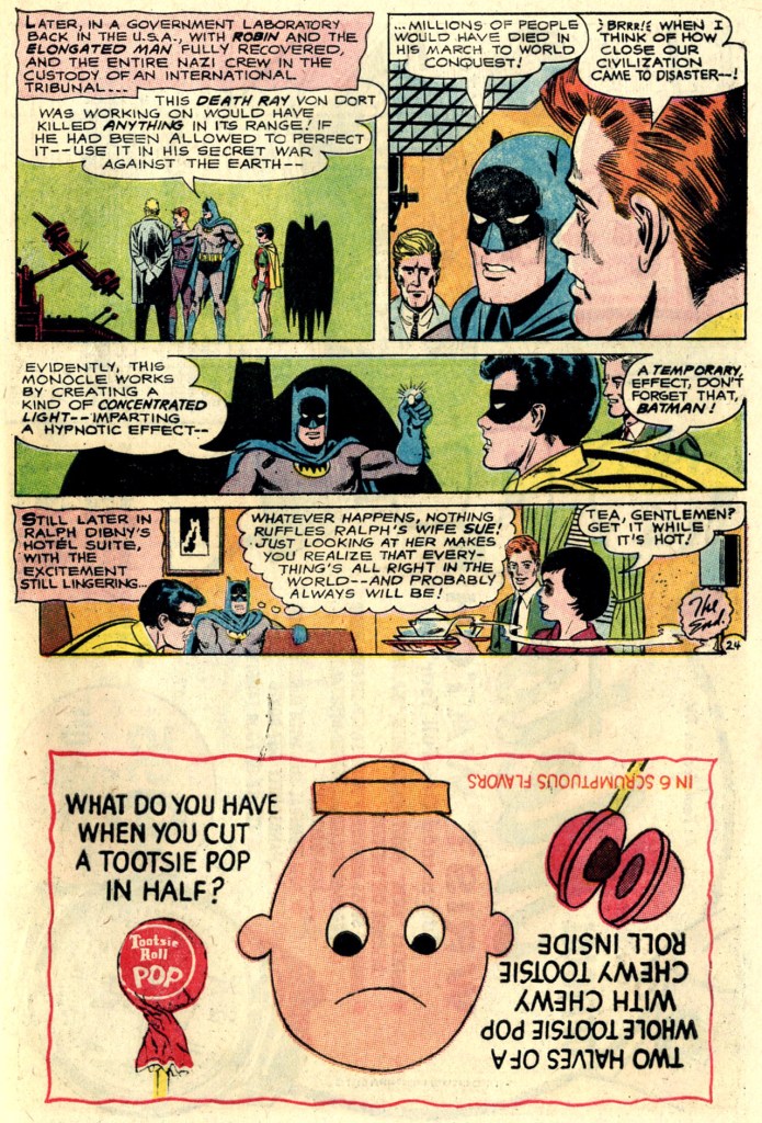 With E-Man out of the fight, Batman and Robin are left to deal with Von Dort on their own. Robin is swiftly overcome by the former Nazi’s mental power, but Batman keeps his head down and his eyes closed behind his cowl as he rushes the General, knocking him unconscious with a single skillful punch. And it’s all over. Von Dort never gets to perfect his death ray, the M-244 is returned to teh authorities, and the General and his gang of underworld criminals are all arrested. So it’s a perfectly clean Silver Age win.