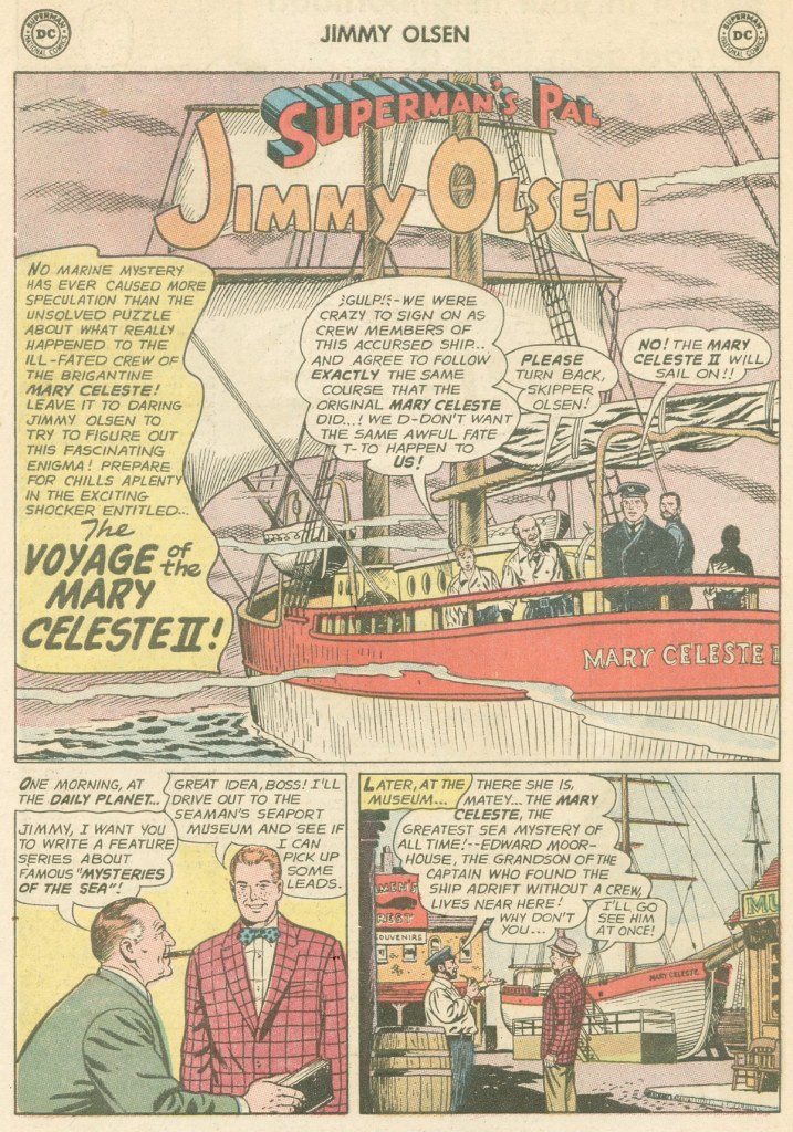 The second story was a step up, at least in terms of the artistic size of the equation. It was illustrated by the Superman A-team of Curt Swan and George Klein, and written by Superman’s co-creator Jerry Siegel. The story’s a bit of a pot-boiler in which Jimmy is given the assignment by editor Perry White to do a feature on Mysteries of the Sea. Accordingly, the cub reporter attempts to solve the historic mystery of the Mary Celeste, a ship whose crew completely vanished during its voyage. Jimmy attempts to duplicate the conditions under which the original Mary Celeste sailed in an attempt to find out what happened to its manifest.