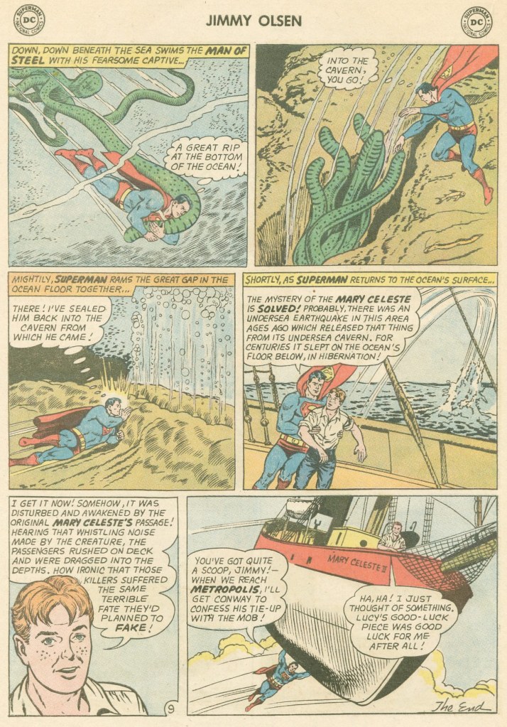 Unfortunately, the crew Jimmy mans his boat with turn out to be criminals who are looking to get out of the country before the FBI can locate them, and they soon overpower young Olsen. But at a certain point, they too all vanish, baffling Jimmy. It’s all part of their plan to escape the authorities and assume new identities, but Jimmy is able to see through their ruse and expose it. And Superman shows up to prevent the Mary Celeste II from being destroyed by a strange sea creature–said creature purportedly being responsible for carrying off the crew of the Mary Celeste years earlier, just as here it winds up grabbing and killing the criminals who were menacing Jimmy. Neither he nor Superman seem too worried about this loss of life, though.