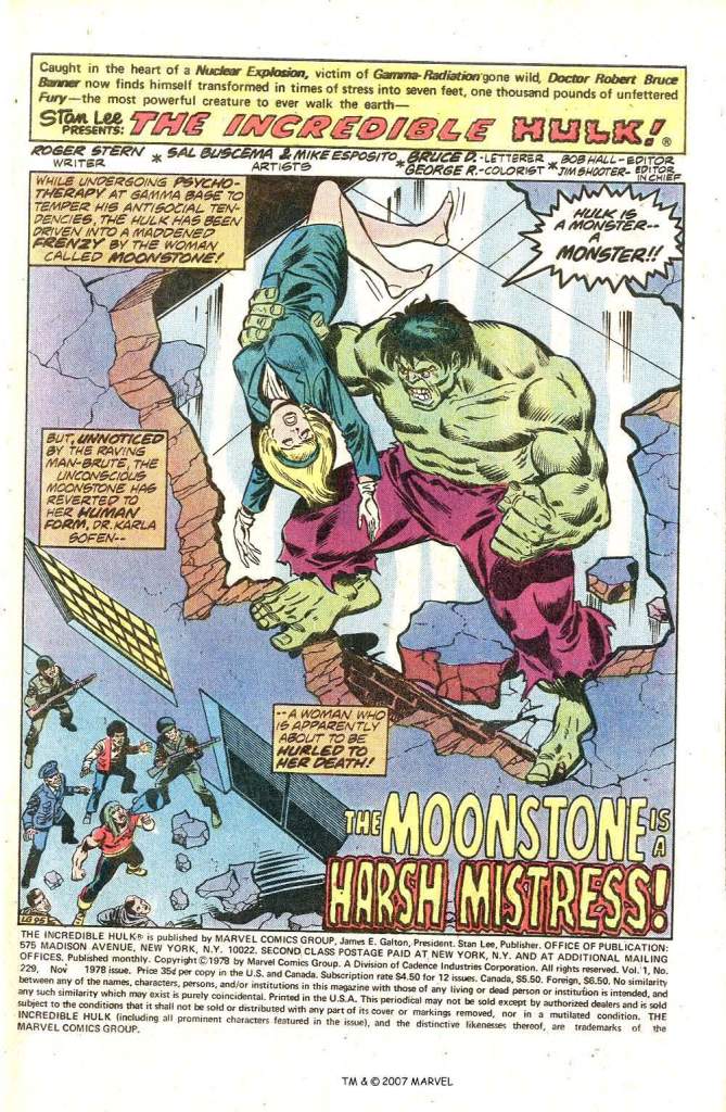 Roger’s storyline began with efforts on the part of recurring character Doc Samson to psychoanalyze the Hulk, to get to the root of his dual persona. Psychoanalysis was a much-discussed thing in the 1970s, and so this tracks as a relevant of-the-moment notion to apply to this fictitious character. Thanks to an overdose of gamma radiation, the Hulk was stuck in his Hulk form for a week or two, requiring Samson and the personnel at Gamma Base to look after him, to keep him out of trouble. This became a much greater problem after Karla Sofen, an old colleague of Samson’s who had stolen the empowering gemstone of an old Captain America villain, showed up to help Samson with his process. She was really there to steal military scientific secrets in her Moonstone identity. But the Hulk had come upon her and a fight had broken out. As it burst the confines of the building. Sofen resumed her civilian form, making it seem as though the savage Hulk had attacked an innocent woman.
