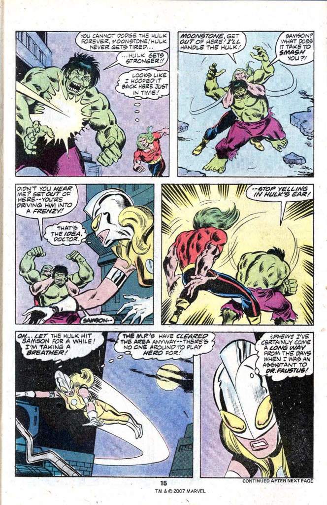 But Moonstone’s back is figuratively against the wall. She’s used up so much of her energy on this fight that she’s having a hard time remaining in her Moonstone costume and form. It’s a this point that General Ross shows up, armed with a Gamma Gun and intent on taking down his eternal quarry. He sees Moonstone transform back into Karla Sofen the same way that the Hulk does. But the General’s been going through some tough times of late, and as Karla transforms back and forth between her two identities, she causes Ross to have a full-on nervous breakdown. He crumples to the ground between the Hulk and Sofen.