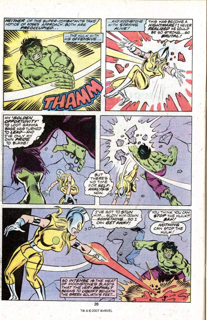 Moonstone rejoins the battle at this point, and she’s misinterpreted as a new super hero by the media due to her actions. She still has her sights set on looting Gamma Base of its secrets, but she figures that she’s got to finish what she started first and get the Hulk out of the way. So this becomes a running battle between the two on the grounds of the base, with Moonstone slowly realizing that, even with her great power, she’s maybe gotten herself in over her head. The Hulk never stops, never gets tired, and keeps on getting stronger. But that said, Moonstone’s real weapons are words, and she strikes at the Hulk’s sense of self, calling him a monster and driving him into an even greater fury.