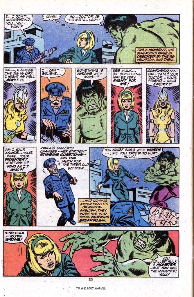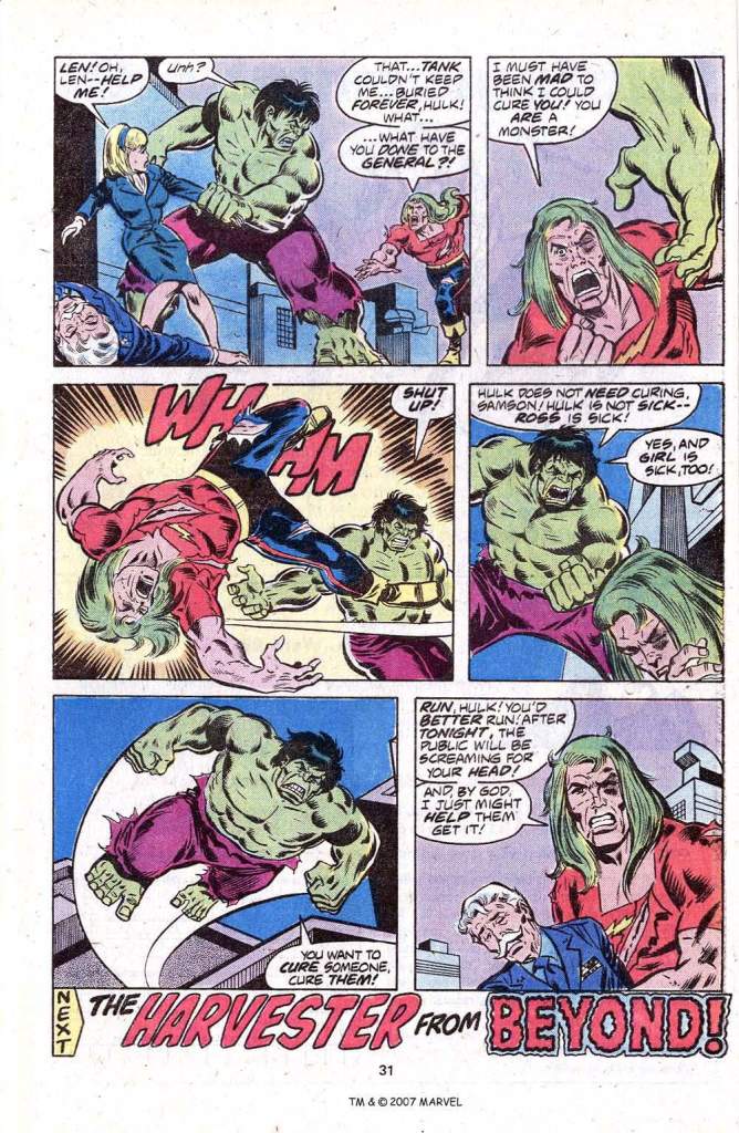 It’s at this point that dopey old Doc Samson shows up again, and he of course assumes that Ross’s collapse was due to the Hulk’s actions. He flips out, calling the Hulk by the same name that Moonstone had used, monster. And the Hulk has had enough. Backhanding Samson away from him, he leaps off into the night sky. And the issue ends with Samson swearing to do something about the Hulk, Ross unconscious, and Karla Sofen still safely ensconced among them. It isn’t quite To Be Continued in a literal sense, but the ongoing soap opera of the Hulk’s life would continue to play out from here.